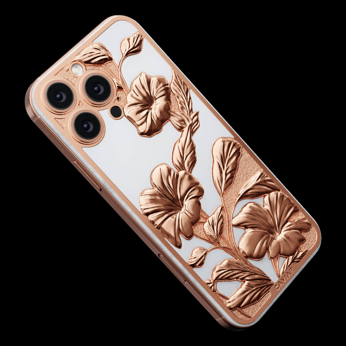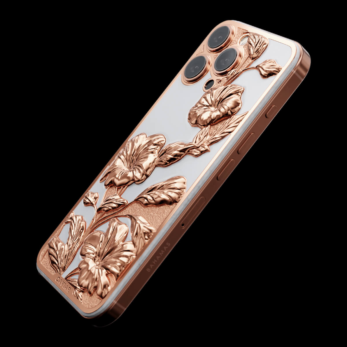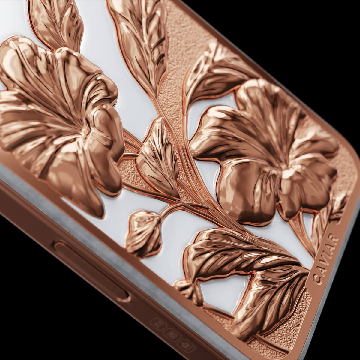 Caviar embodied the beauty of this tropical paradise in the design of a custom iPhone. The device's snow-white background is made from stone, resembling the sandy shores of the islands, while delicate floral patterns capture the fullness of the tropical flora. The pink gold framing adds warmth, echoing the sunsets reflected in the water.