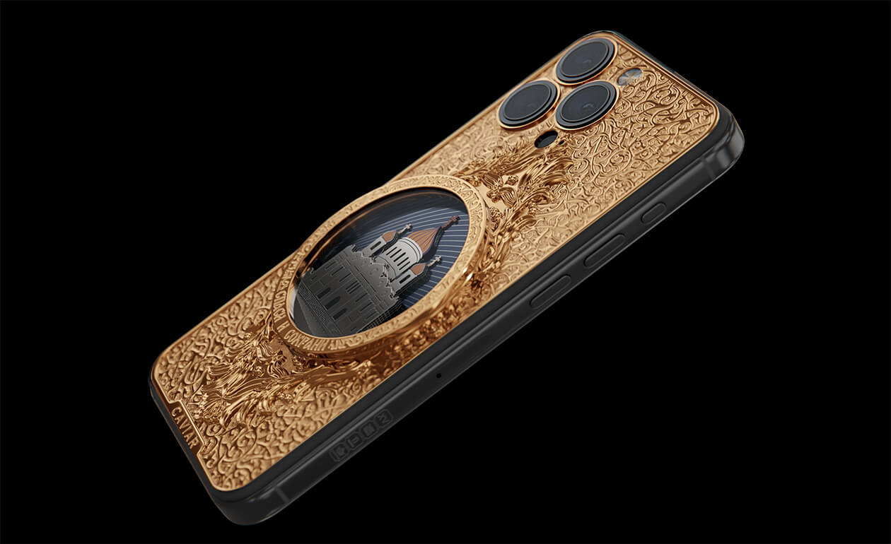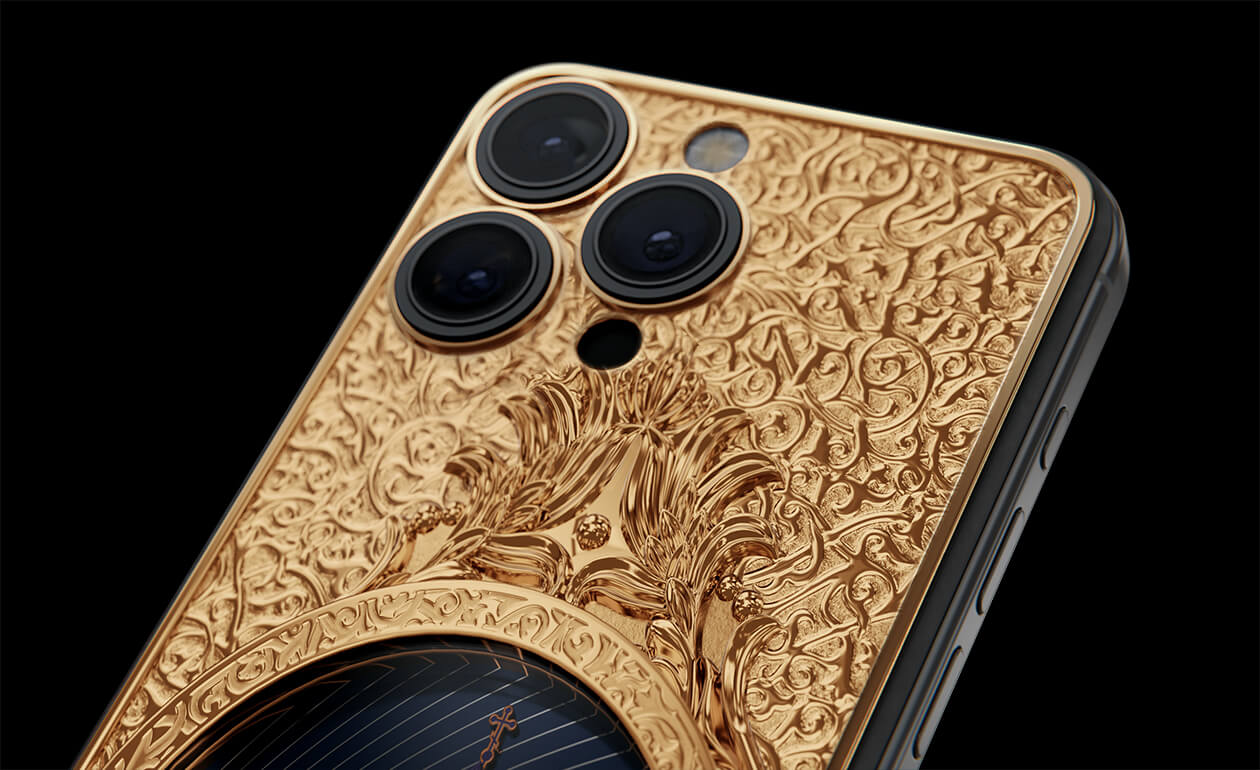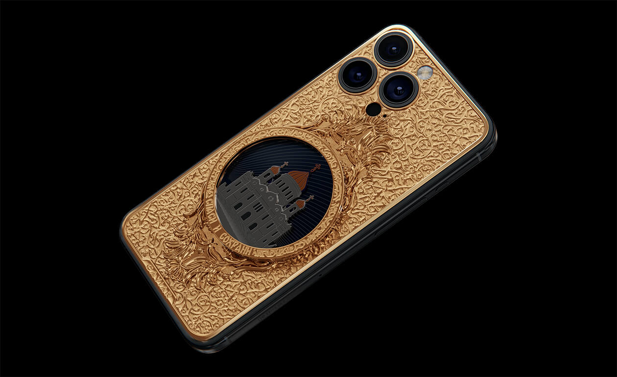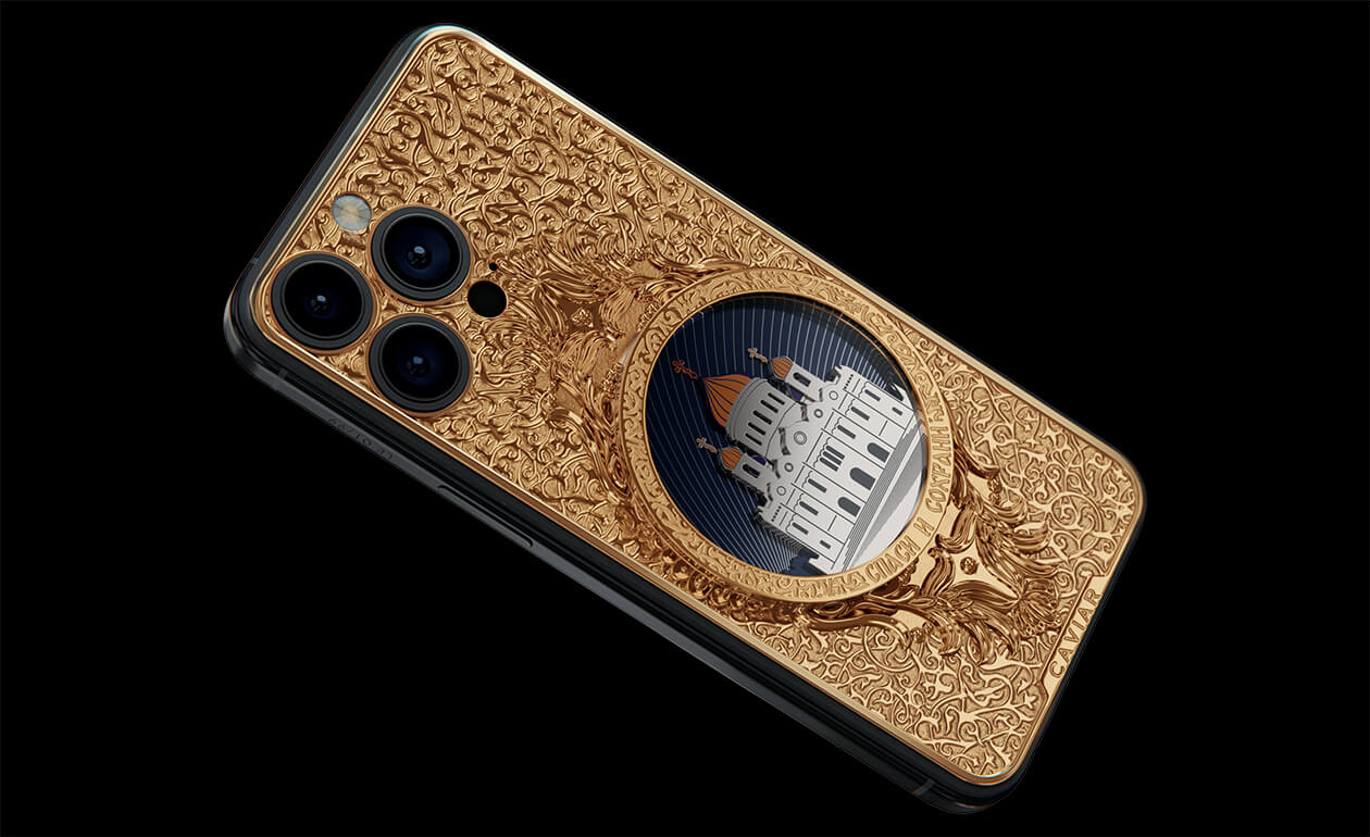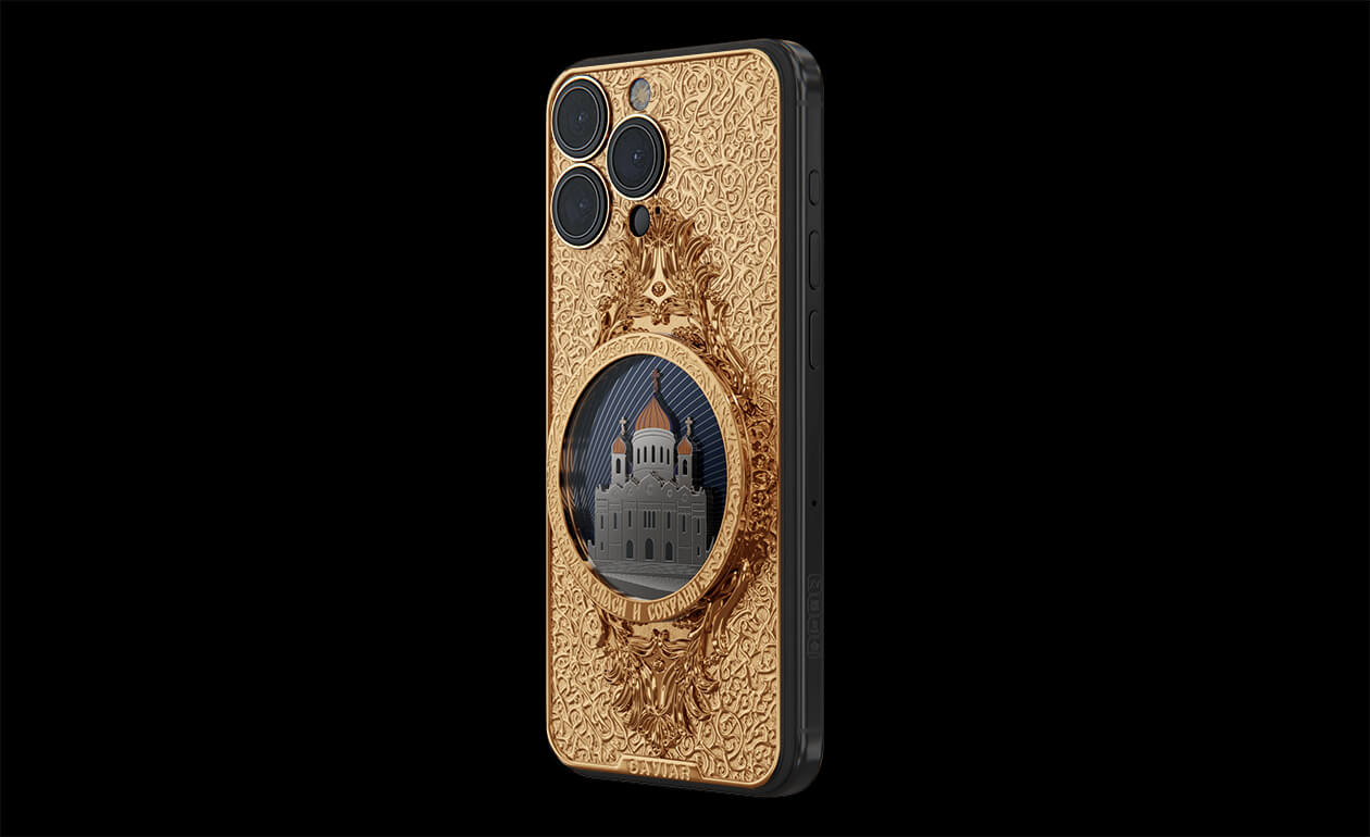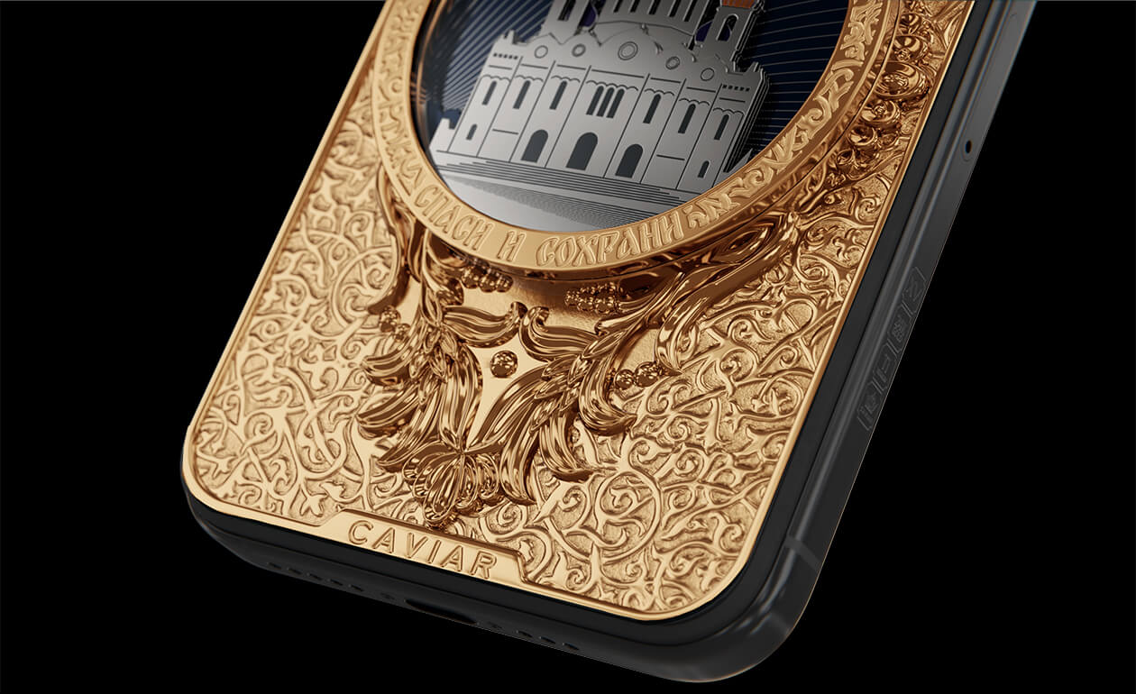 The phone's design gracefully combines titanium and Double Gold Electroplated elements (999-fineness, 7 microns) to create a luxurious masterpiece. Delightful lines and sophisticated metal engraving pay tribute to the interior decoration of the temple, teeming with leaf-gold, marble, porphyry, and labradorite.