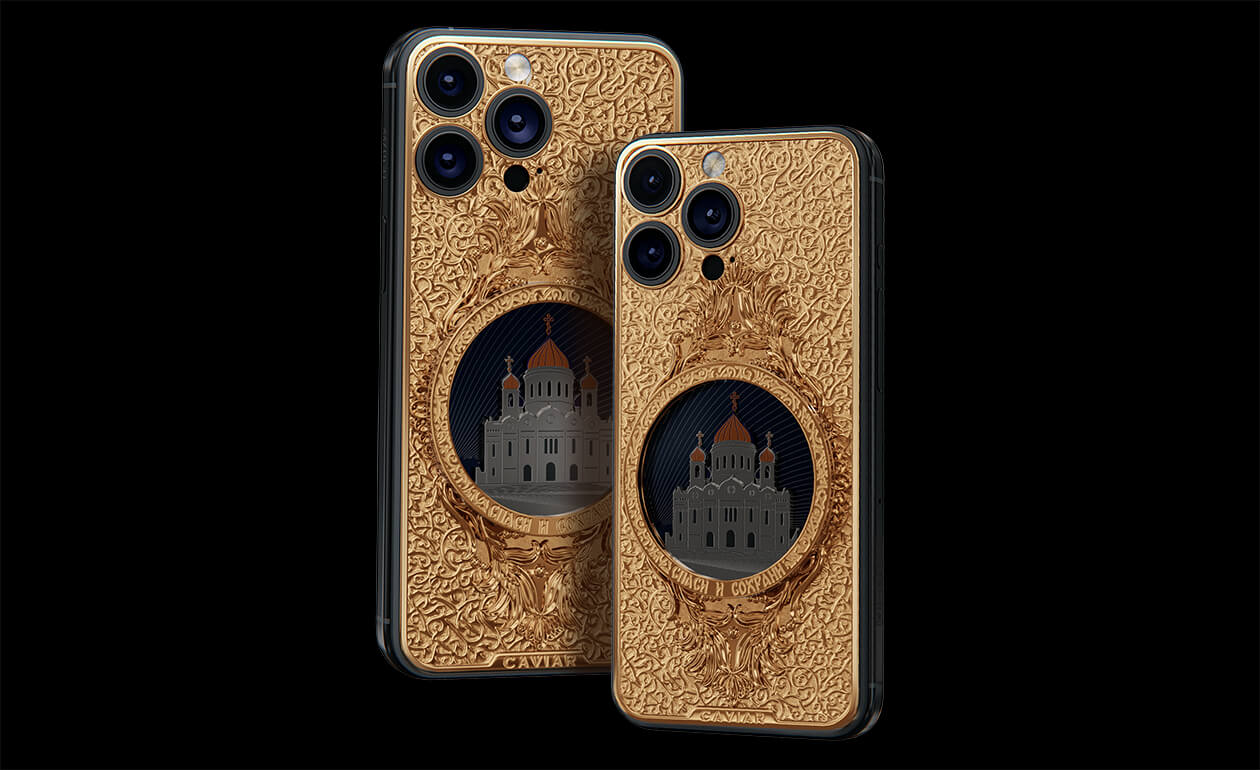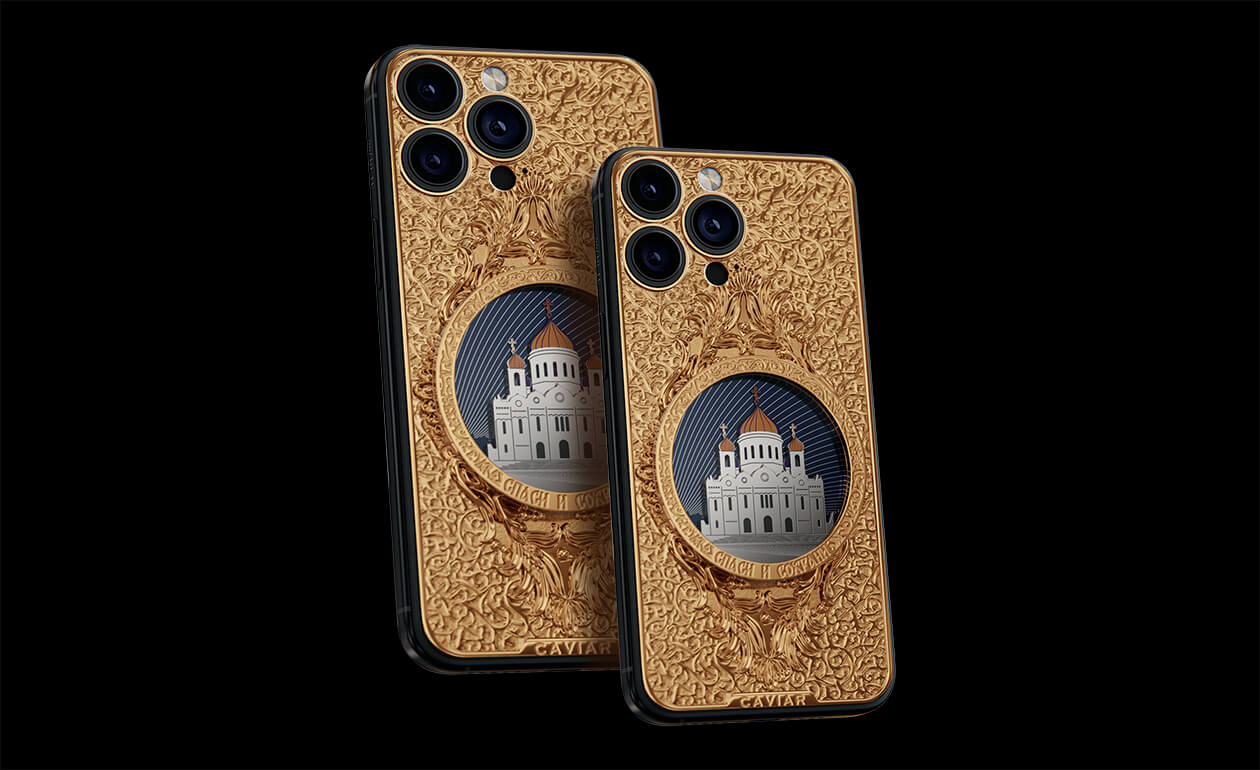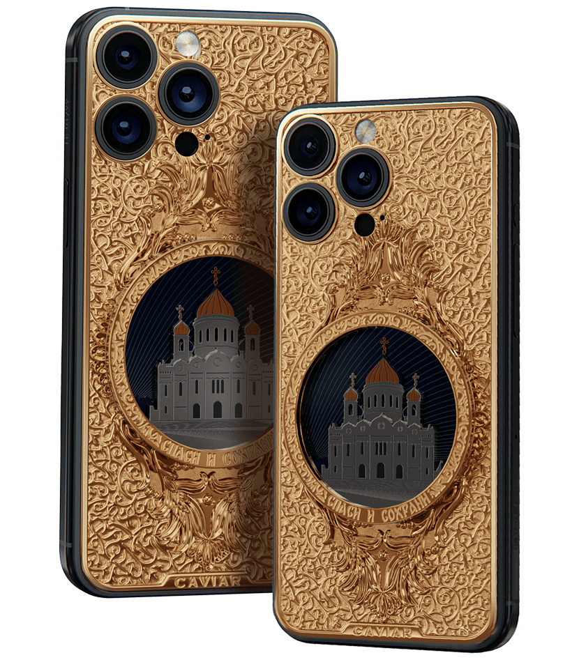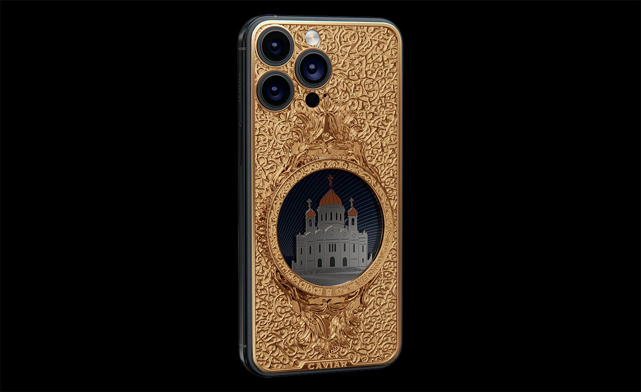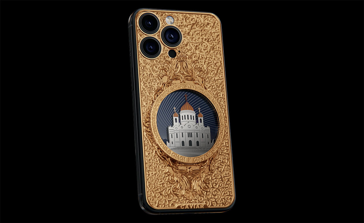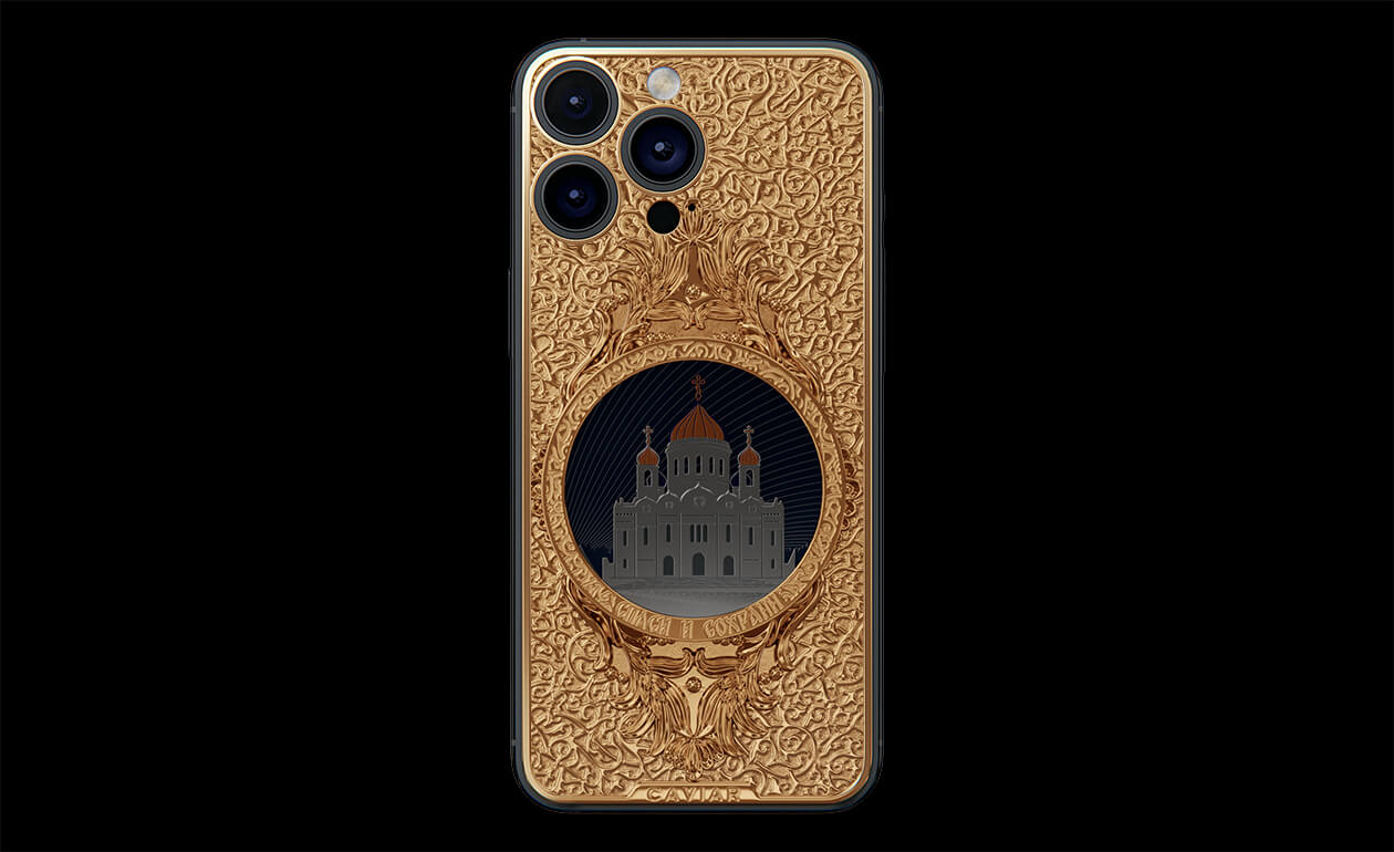 The phone's design gracefully combines titanium and Double Gold Electroplated elements (999-fineness, 7 microns) to create a luxurious masterpiece. Delightful lines and sophisticated metal engraving pay tribute to the interior decoration of the temple, teeming with leaf-gold, marble, porphyry, and labradorite.