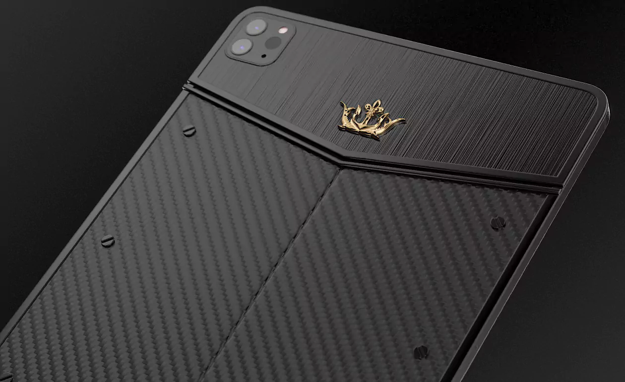 The body is made of titanium with black PVD covering and decorated with a relief rhythmic engraving. An edgy form of Caviar brand “ticks” provides a special dynamic to the model. A bright detail of the tablet’s masculine image are inserts of car carbon with decorative black screws. The bright Caviar crown made of titanium with gold PVD covering is set off on the background of the device’s black body.