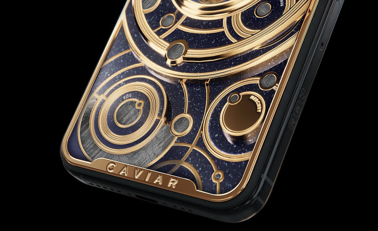 At the core, there is so well-loved iPhone design with a tourbillon watch. The fascinating tourbillon rotation accurately reflects the specifics of the planets’ movement in the orbit. The exaggerated cyclicity enclosed in the endless gold circles seems to convey the very essence of the space nature: the endless movement of many system elements.