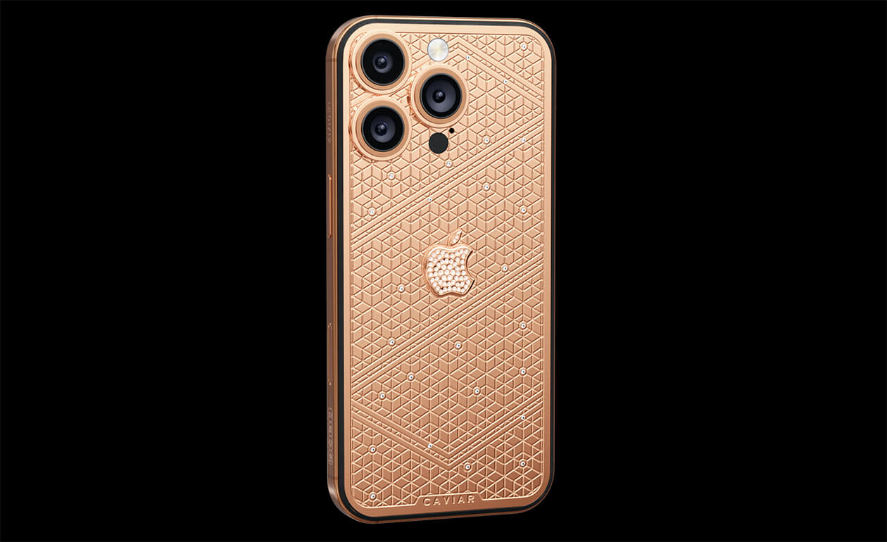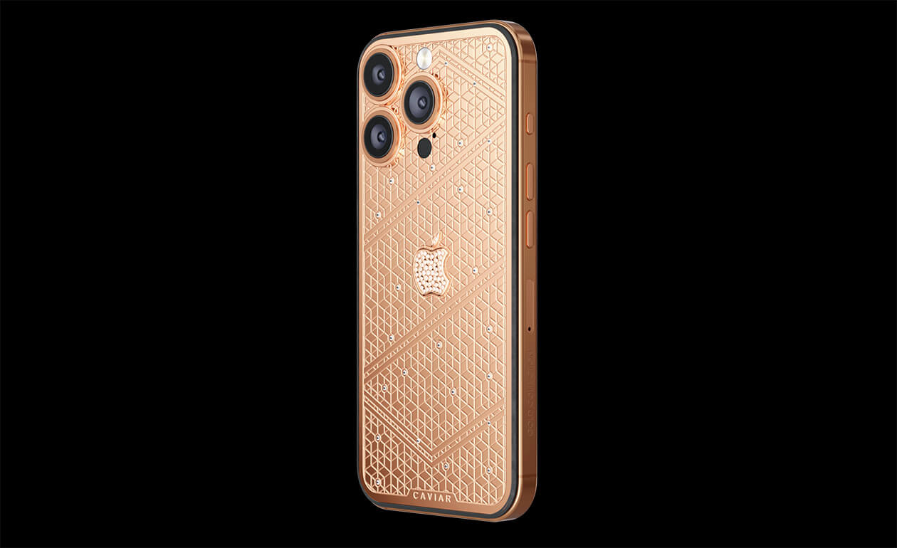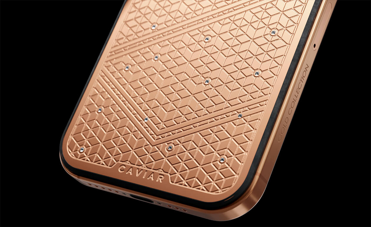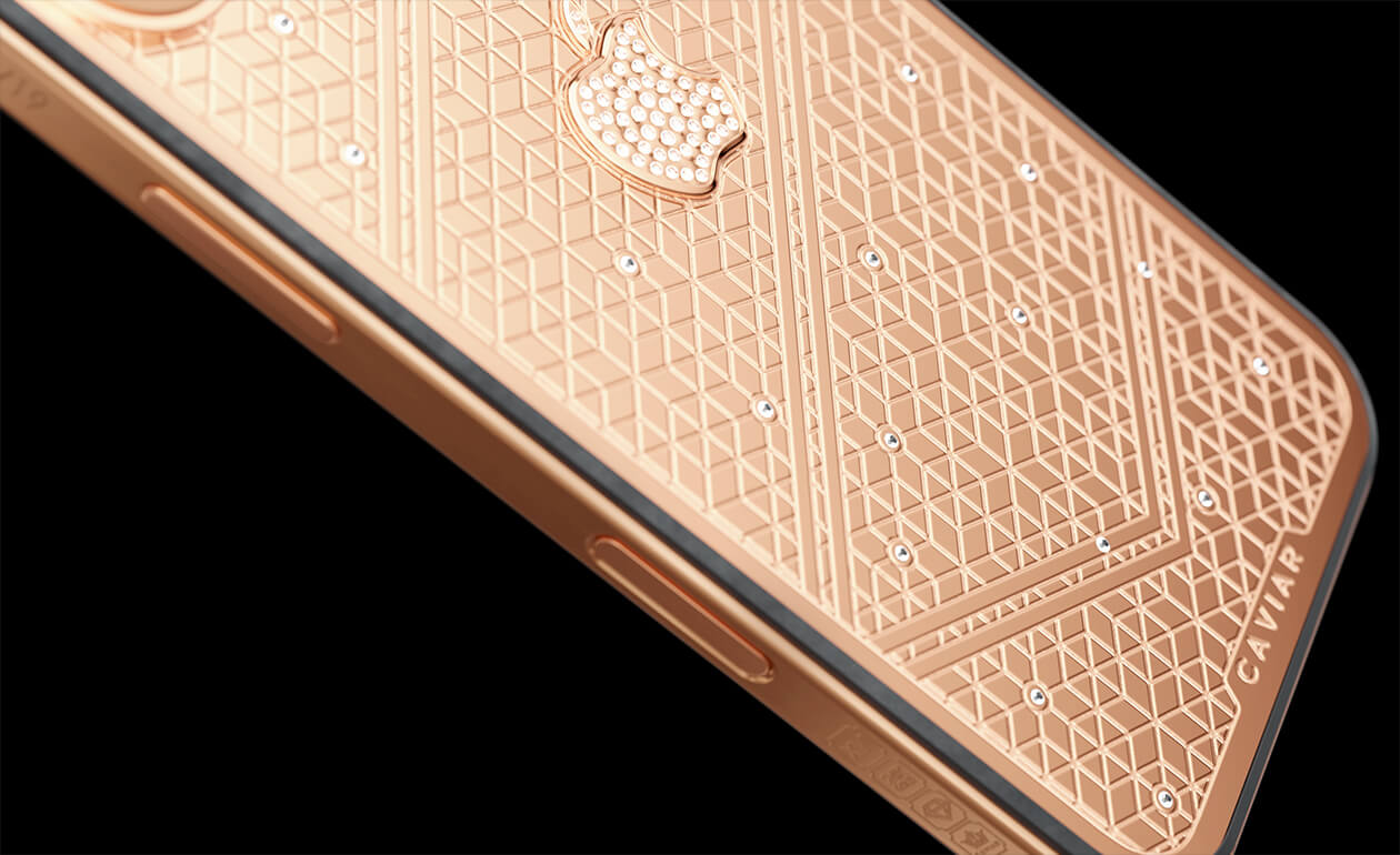 Caviar's masters have captured the golden sunlight reflections in the iPhone's body. The vivid asymmetry of lines symbolizes creative chaos and the quest for an antique ideal. We have complemented this golden extravaganza with a sprinkling of chrystals. At the center - a precious apple made of chrystal mosaic.