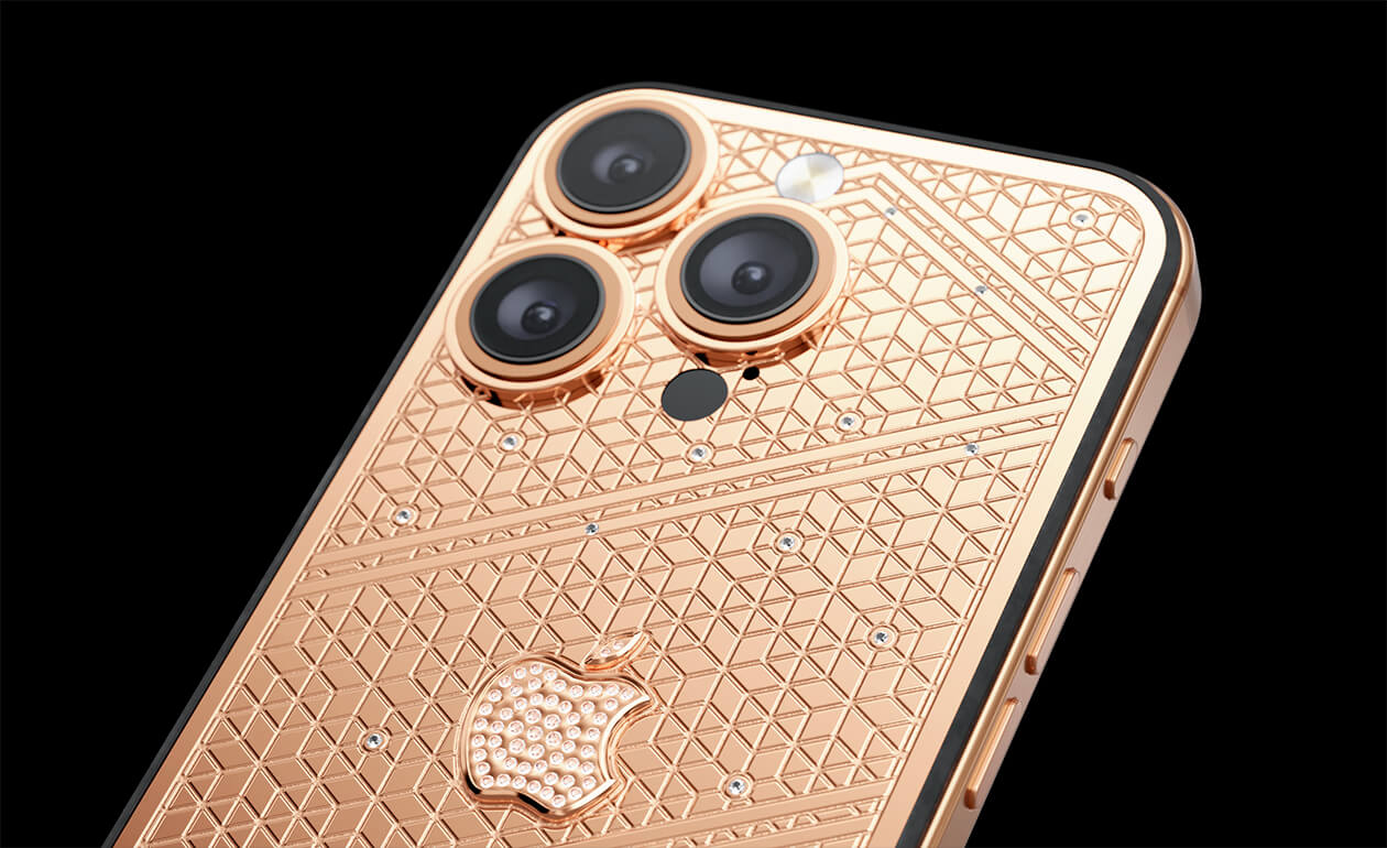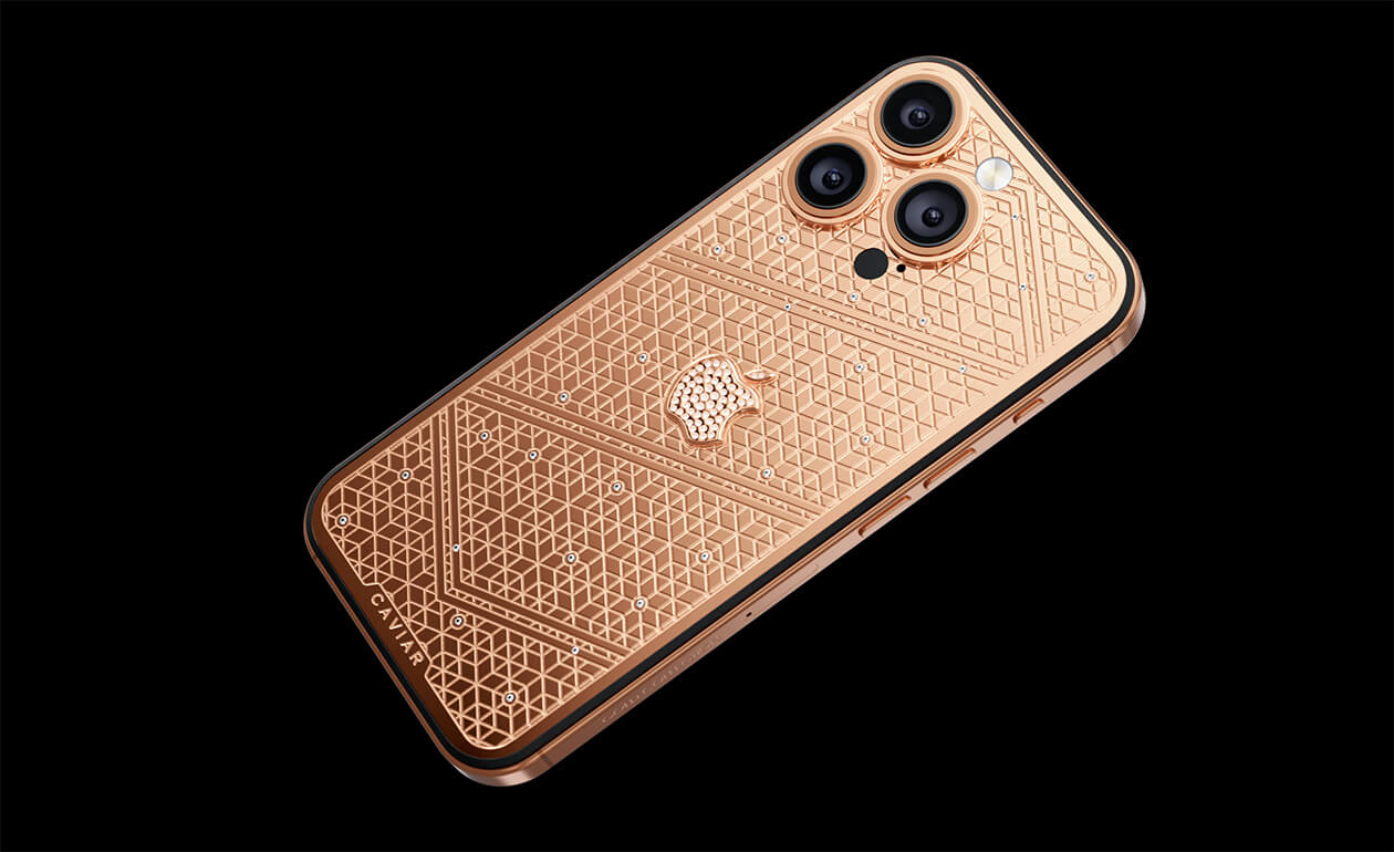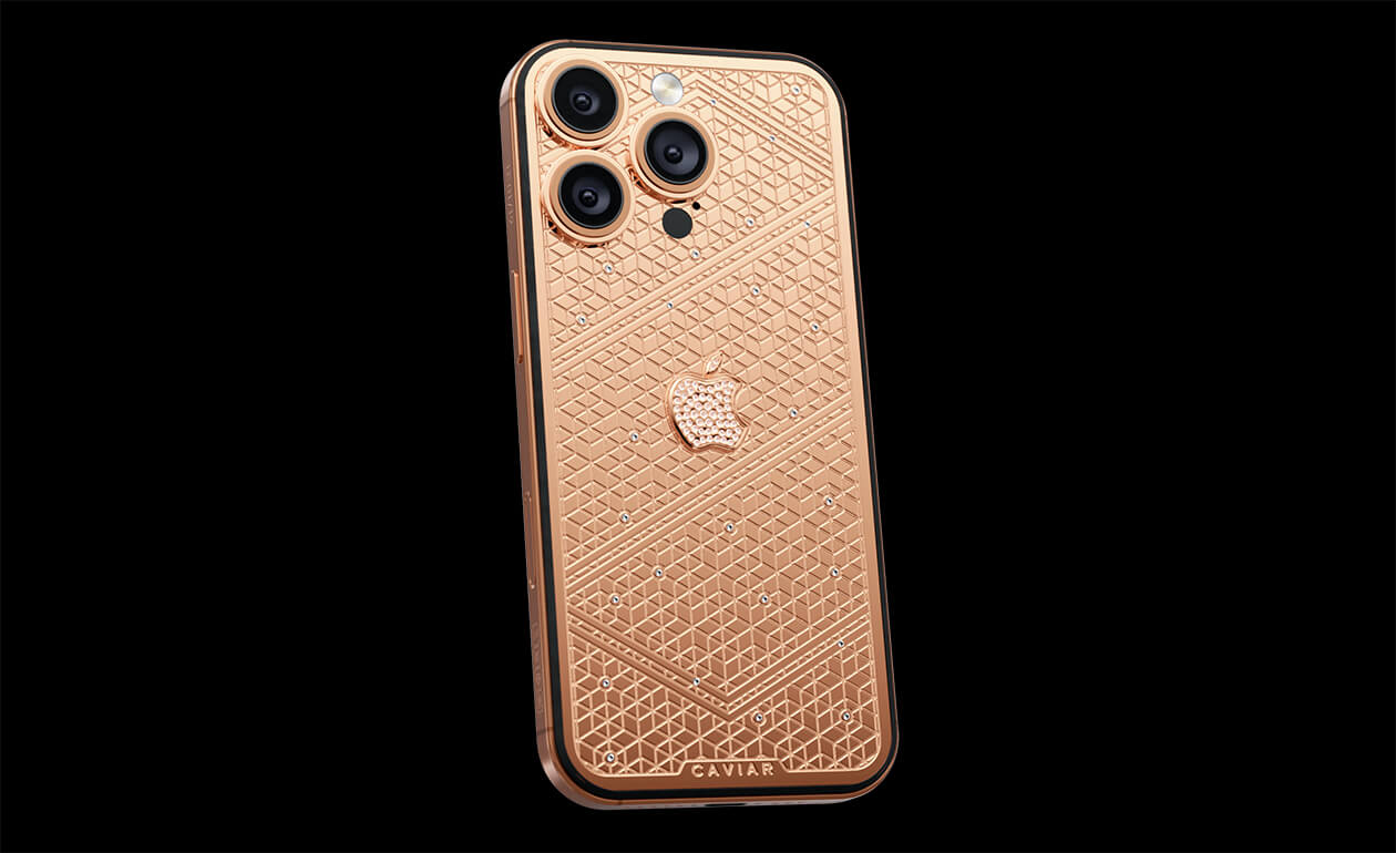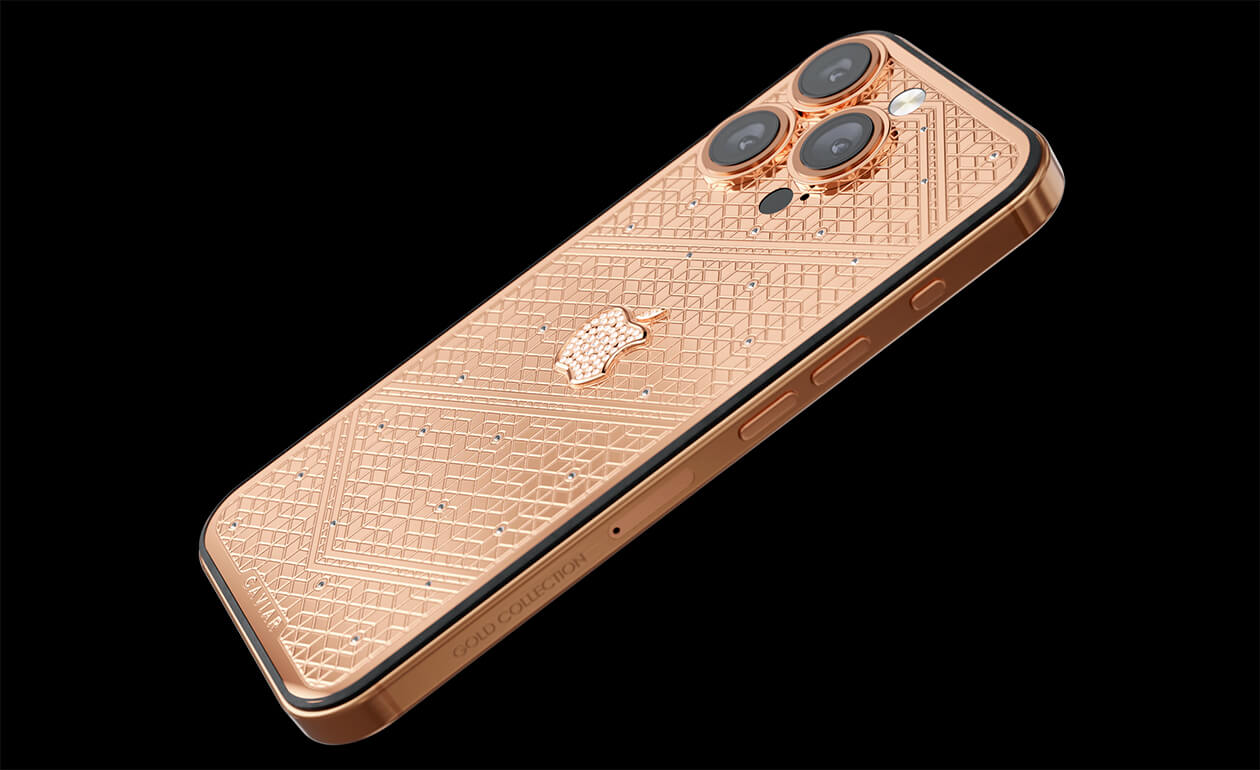 Caviar's masters have captured the golden sunlight reflections in the iPhone's body. The vivid asymmetry of lines symbolizes creative chaos and the quest for an antique ideal. We have complemented this golden extravaganza with a sprinkling of chrystals. At the center - a precious apple made of chrystal mosaic.