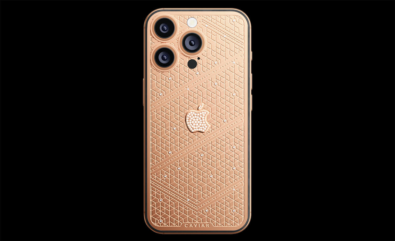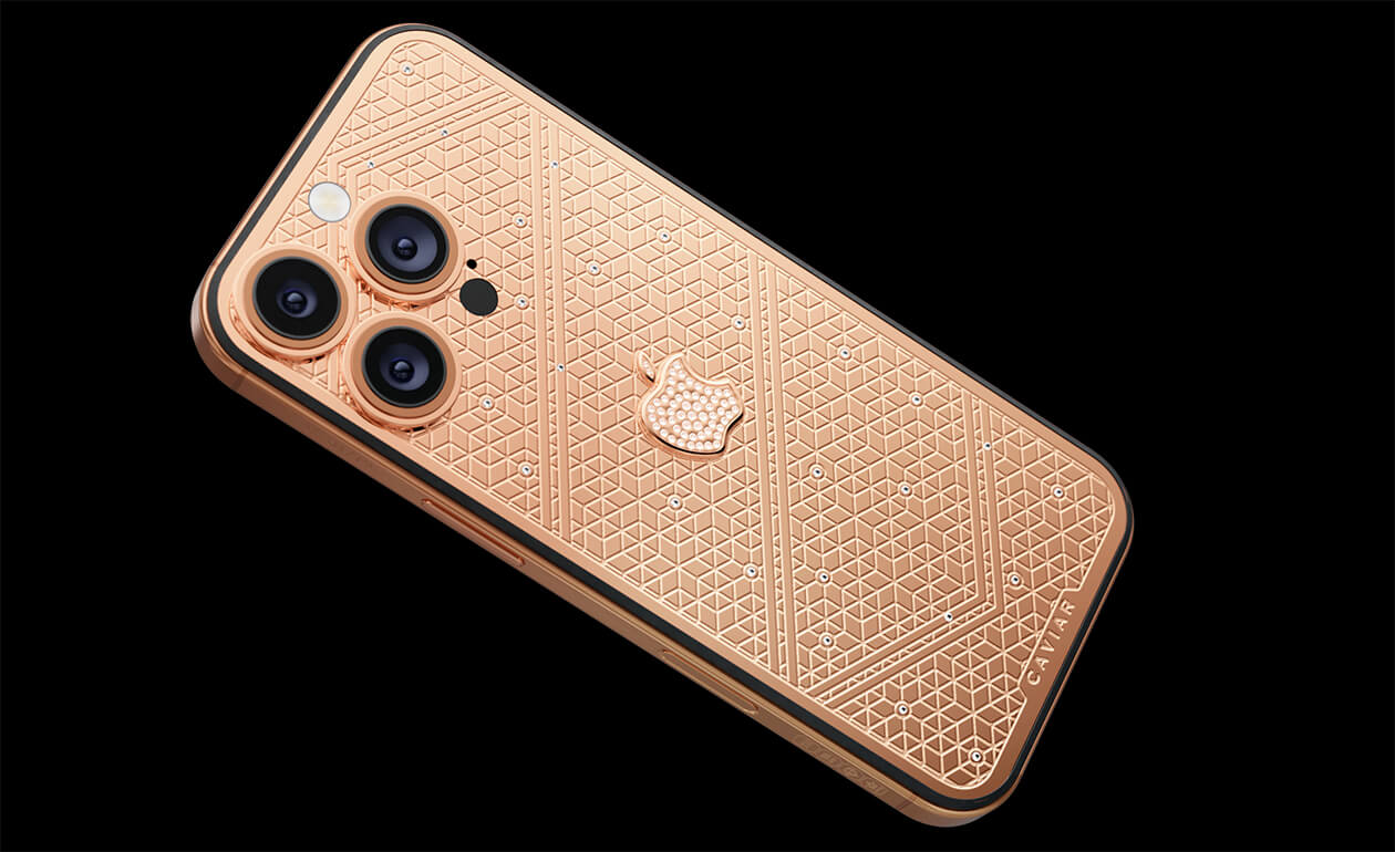 Caviar's masters have captured the golden sunlight reflections in the iPhone's body. The vivid asymmetry of lines symbolizes creative chaos and the quest for an antique ideal. We have complemented this golden extravaganza with a sprinkling of diamonds. At the center - a precious apple made of diamond mosaic.