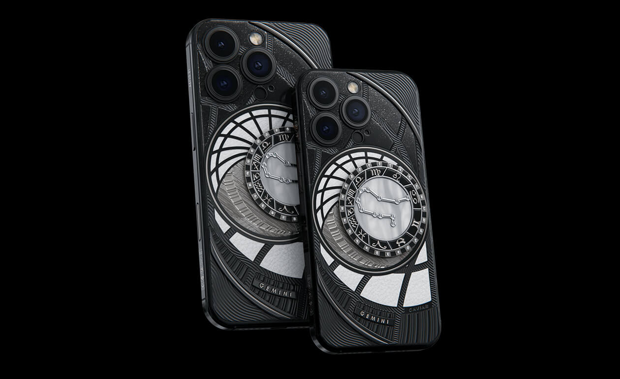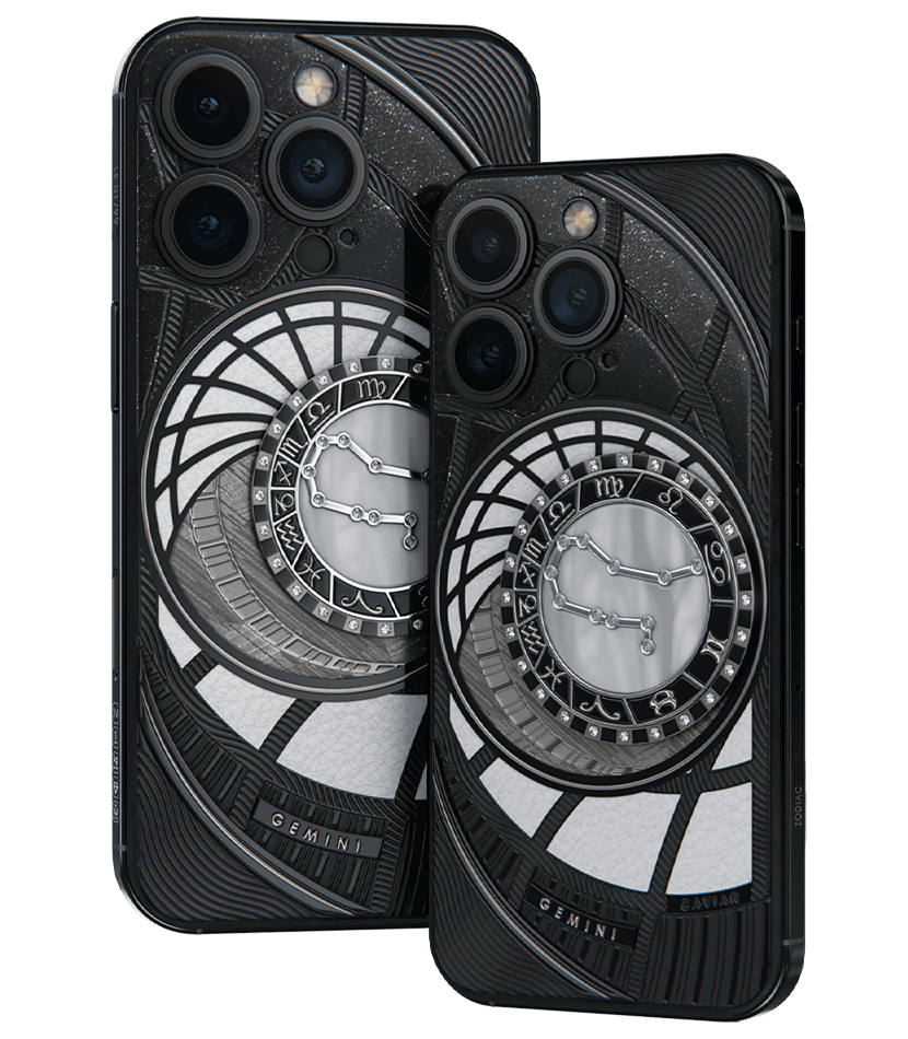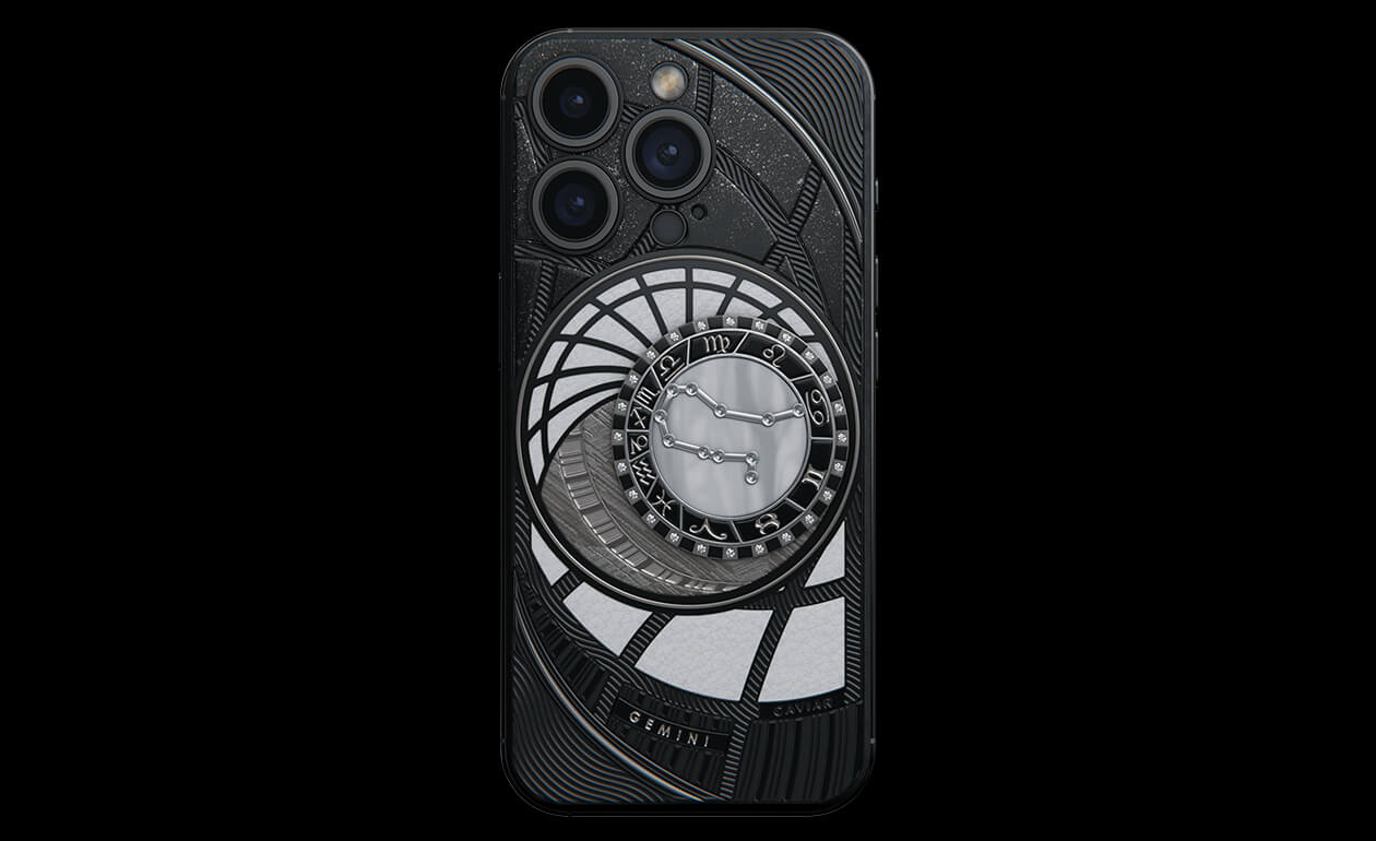 Geminis, today we present to you the Gemini. Your smartphone has a sky vault with your stars on it. This is a panel of 24 Swarovski crystals, created on black titanium with a PVD coating. We highlighted the shine of the crystal placer with a white composite plate and finished the composition with a meteorite fragment on white calf leather.