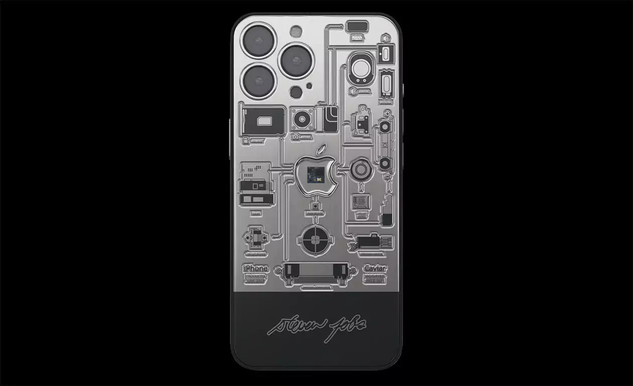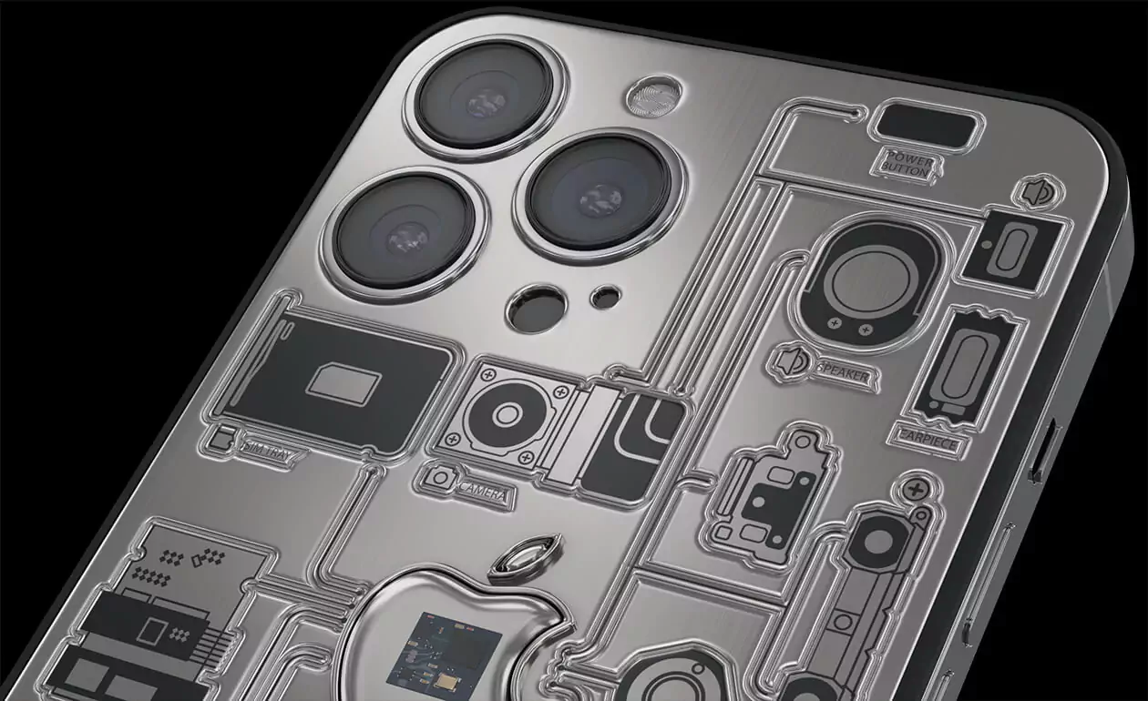 In the center of the case made of aviation titanium, there is a sealed capsule in the form of Apple's branded bitten apple with an embedded fragment of the motherboard of the very first iPhone 2G. The back cover of the smartphone is decorated with high-precision engraving depicting the technical elements of the device, which are connected together. They are striving towards the center of the world - the Apple logo - like a circulatory system pushing blood towards a pulsating heart.
