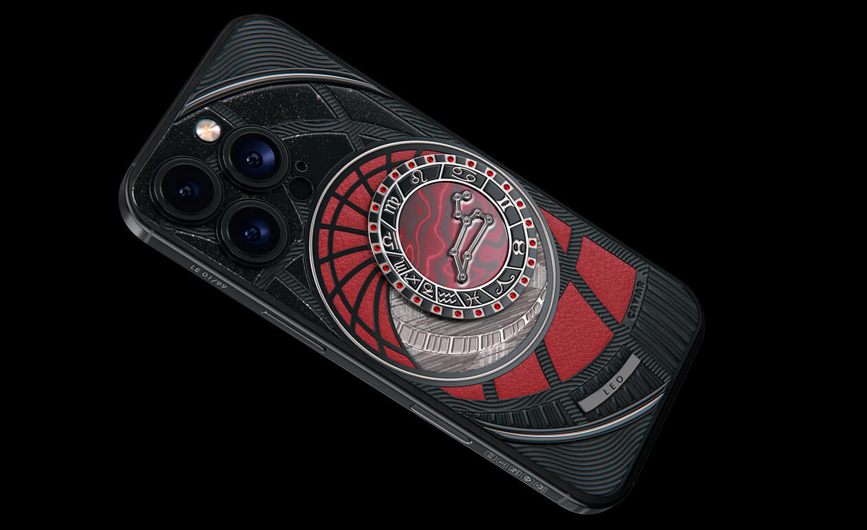 Leos, today we present to you Leo. Your smartphone has a sky vault with your stars on it. This is a panel of 24 rubies, created on black titanium with a PVD coating. We emphasized the glow of the ruby placer with a plate of red composite and finished the composition with a fragment of a meteorite on calfskin in a bright carmine shade.