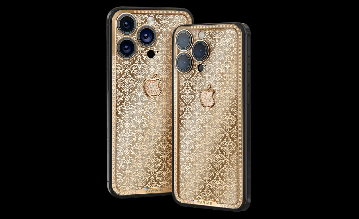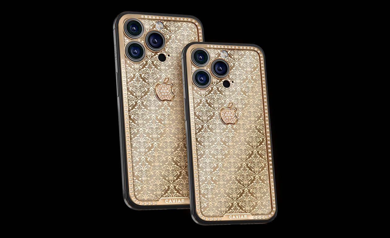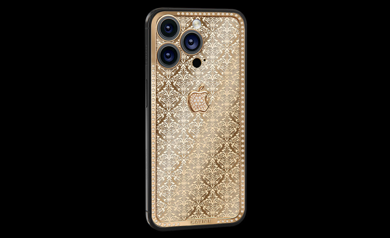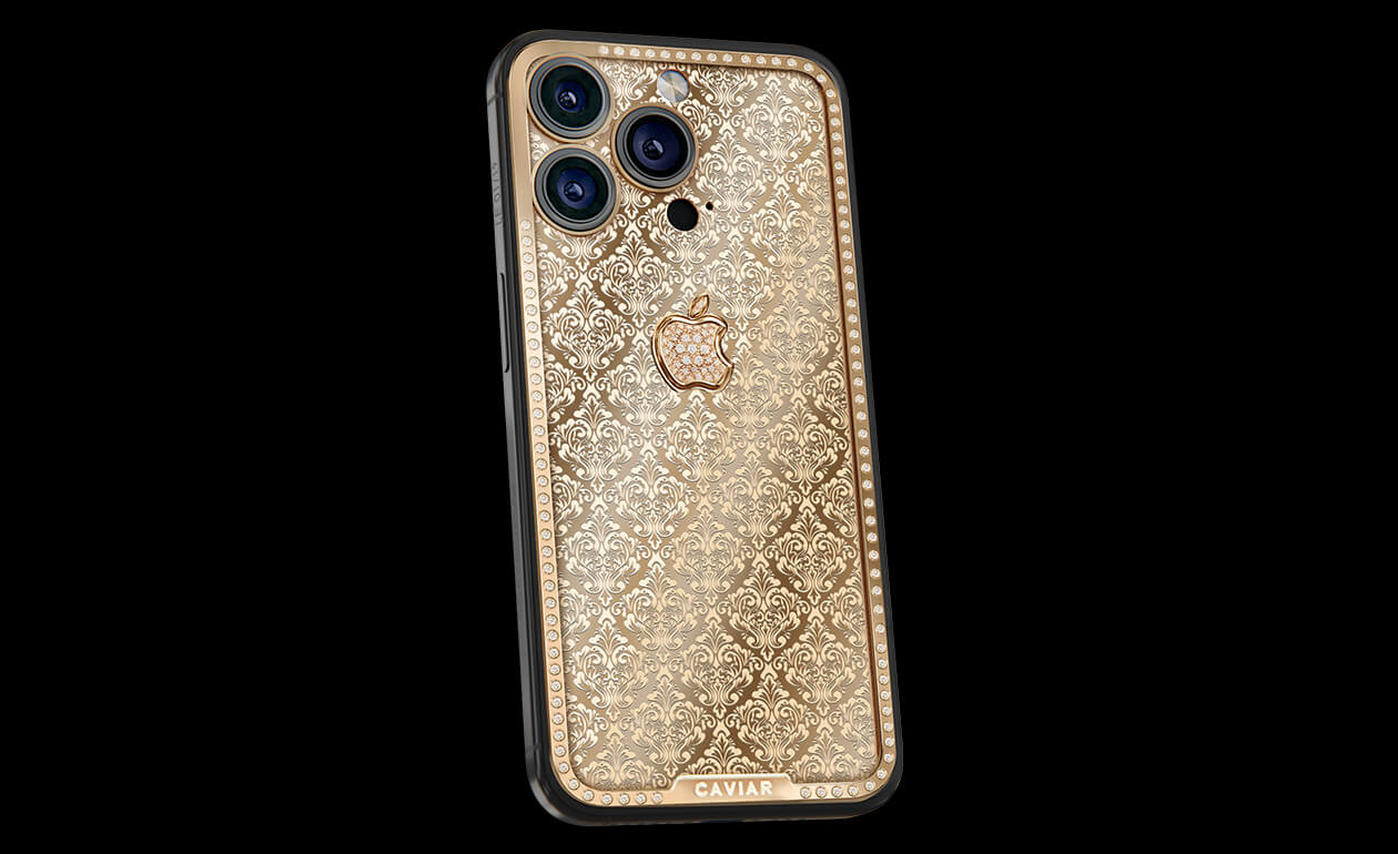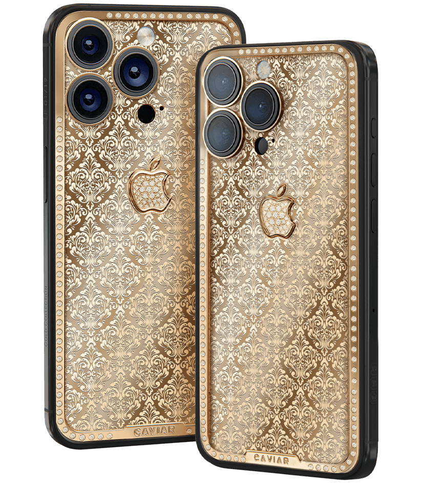 Exquisite design with hints of Swiss luxury watchmaking. Caviar adorned the iPhone case with a scattering of royal crowns. The panel on the golden case is complemented by a magnificent golden apple. The pure radiance of epochal greatness embodied in the most advanced device.