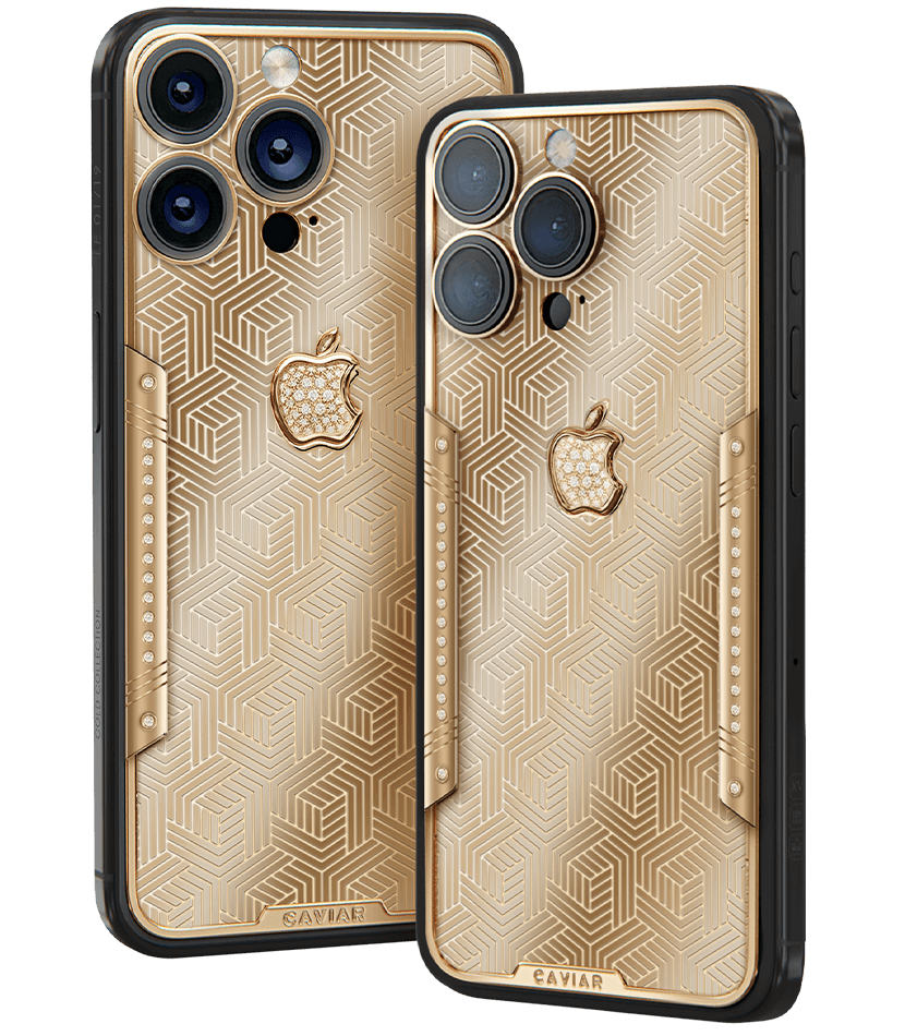 Geometry of luxury on the iPhone's body. Intertwining lines symbolizing the pursuit of perfection. Caviar's masters enhanced the golden splendor with a scattering of diamonds. At the center lies a precious apple made of diamond mosaic.