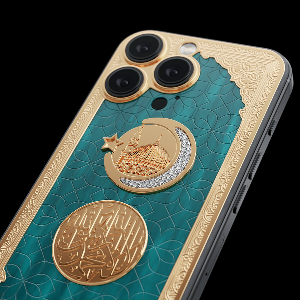 The centerpiece of the design is a detailed 3D insert depicting the Prophet’s Mosque, covered in 24-karat gold and crowned with a crescent moon symbol. Below it lies a golden plaque featuring the Shahada — the Islamic declaration of faith.