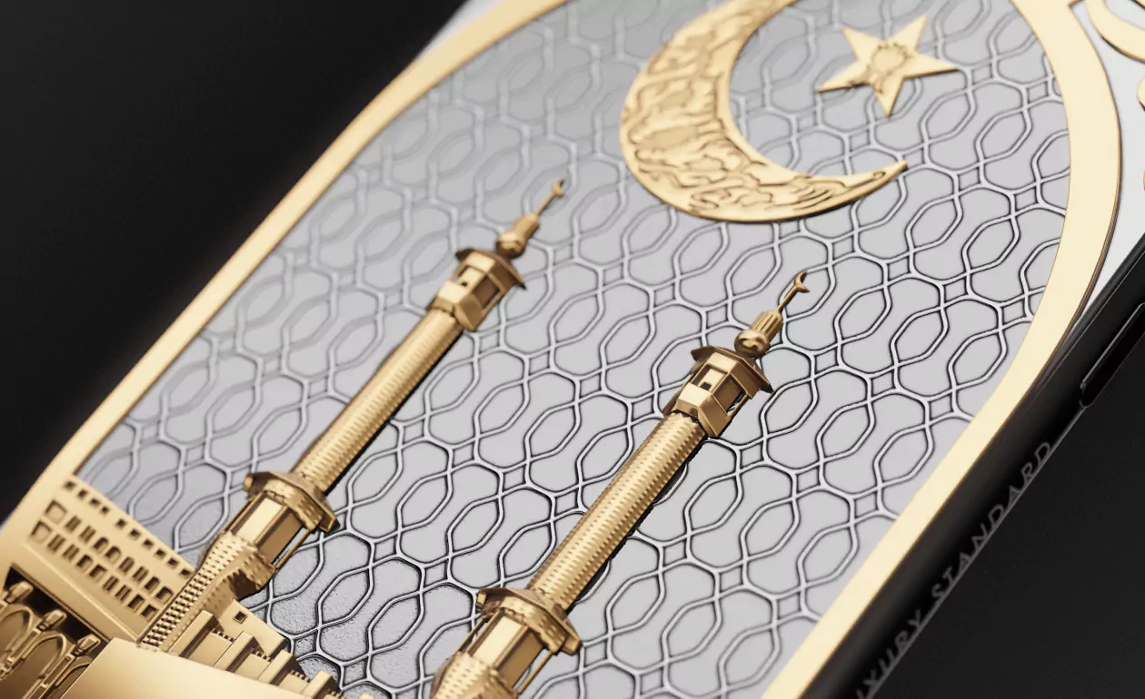 The outstanding beauty, finesse, picturesqueness and elegance distinguish the new model in the collection dedicated to the Islam. The phone’s design harmoniously and spectacularly combines the elements of white titanium and fine yellow gold 750 content producing the expressive play of contrasting shades. On the base covered with white there is the volumetric picture, as if it is embroidered with golden lace, depicting the legendary views of the forbidden mosque Al-Haram in Mecca. The main holy city for the Muslims where the entrance is closed for the representatives of other religions, Mecca inspired the designers and jewelers of Caviar to create this exclusive model.