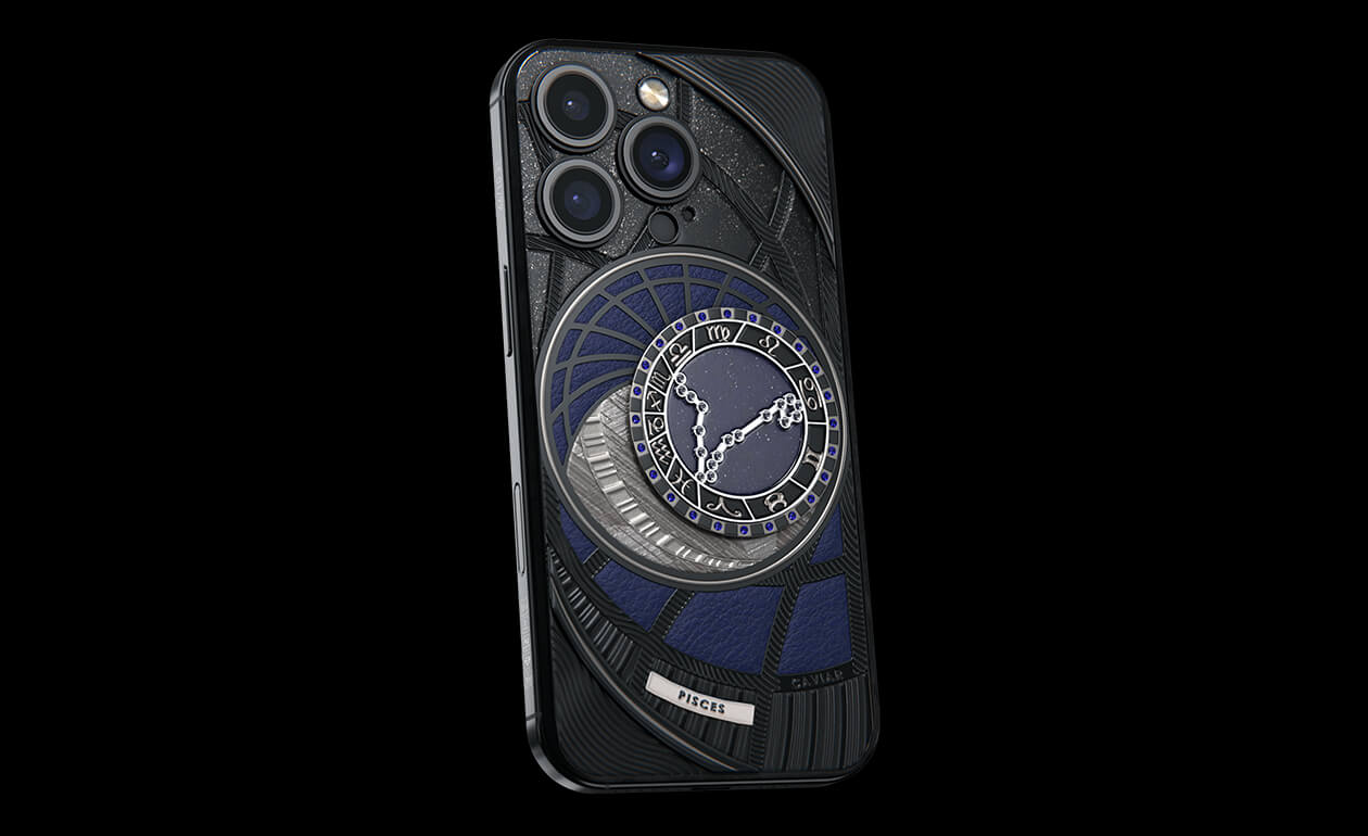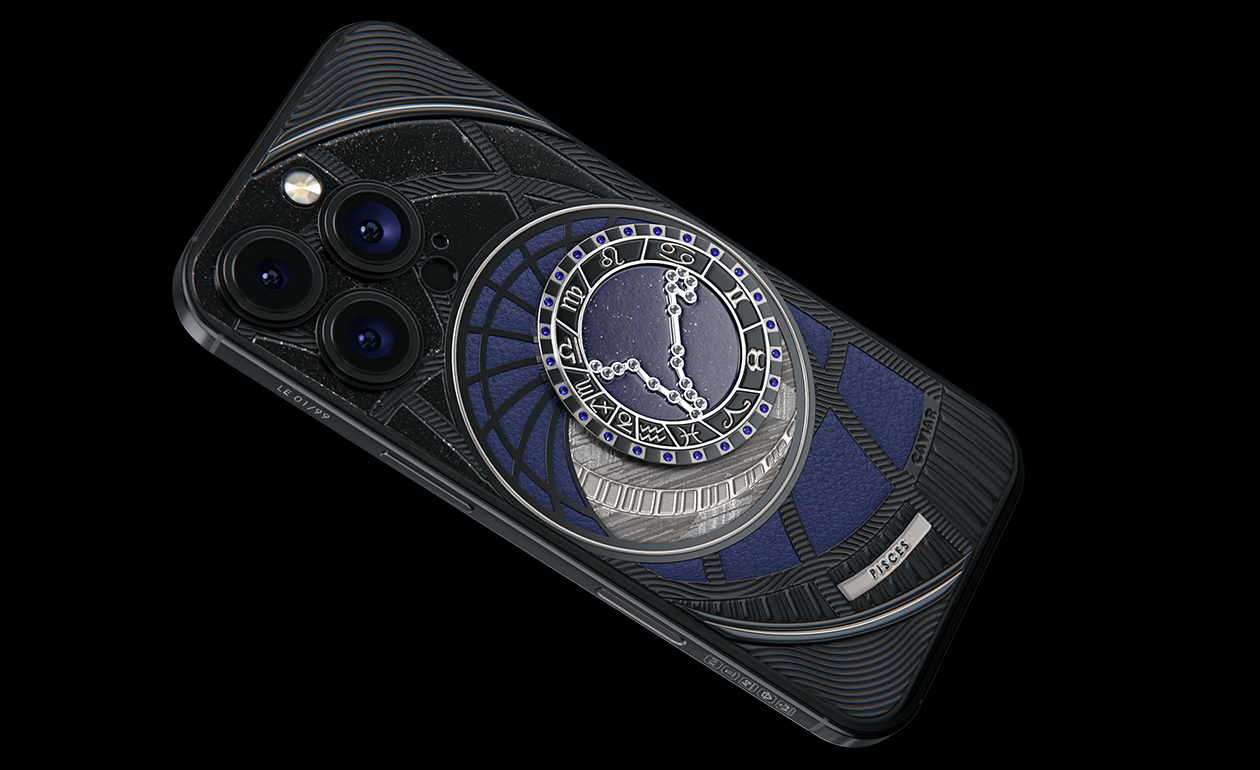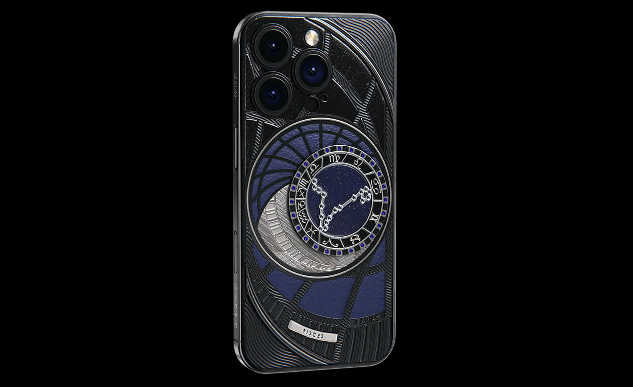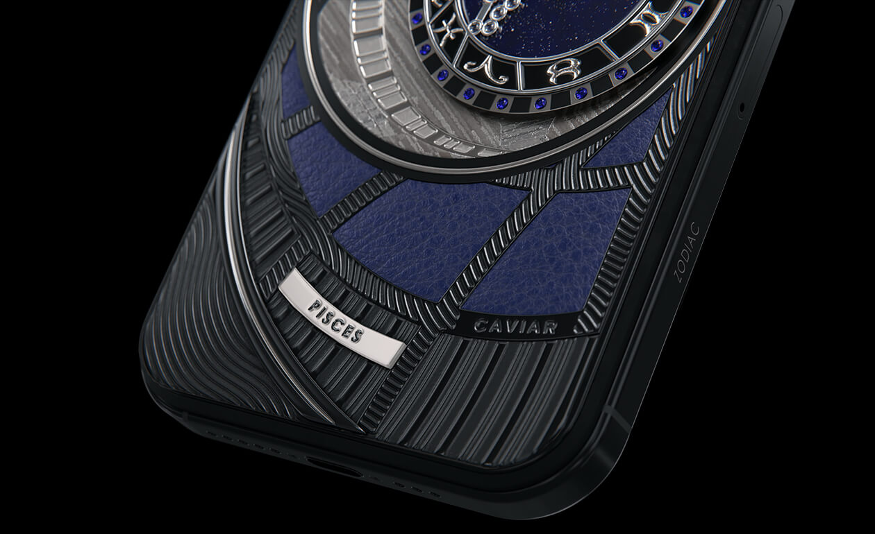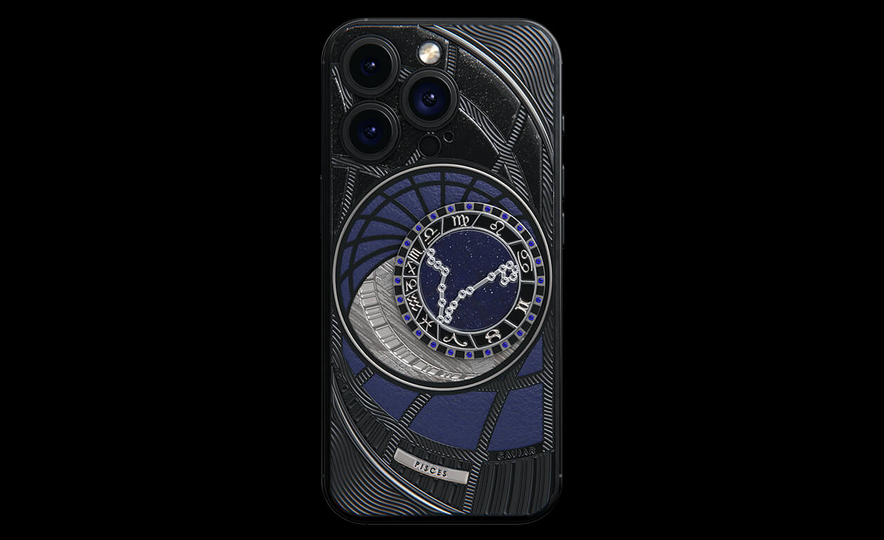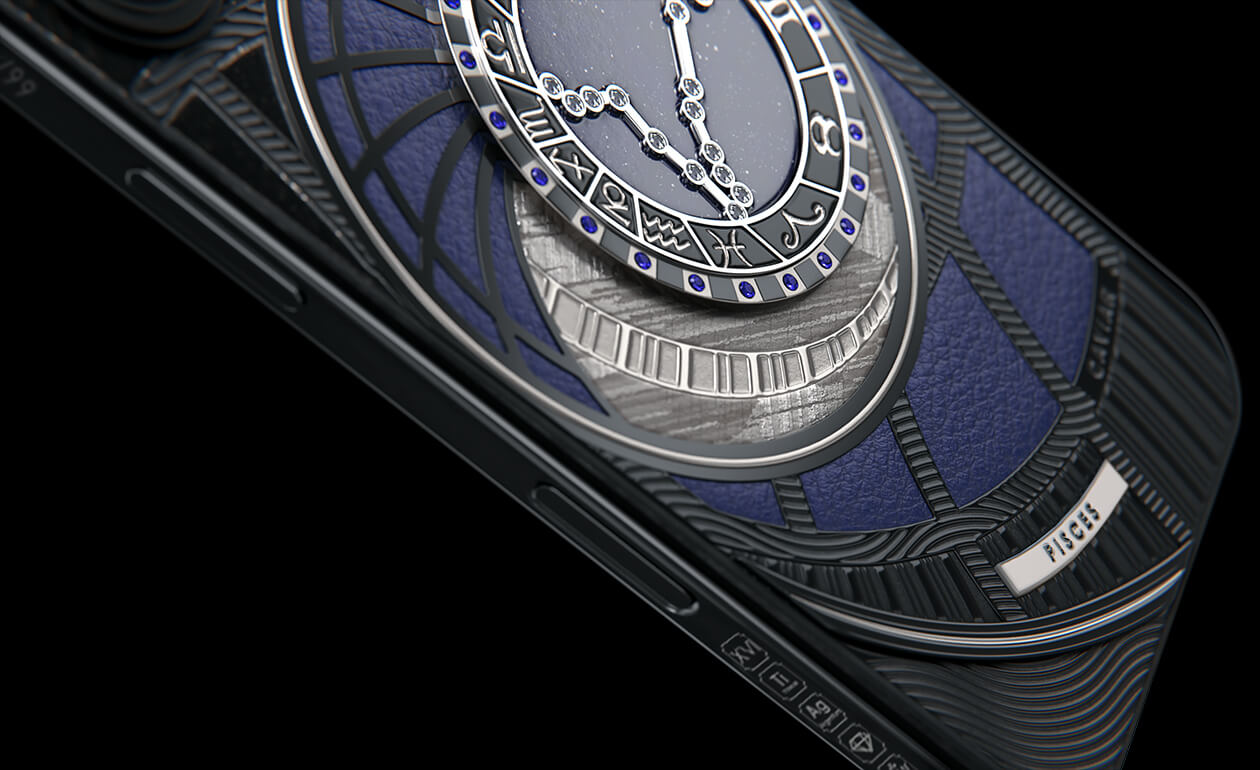 Pisces, today we present to you Pisces. Your smartphone has a sky vault with your stars on it. This is a panel of 24 sapphires, created on black titanium with a PVD coating. We emphasized the shine of the sapphire placer with an blue composite plate and finished the composition with a fragment of a meteorite on calfskin in a bright shade of indigo.