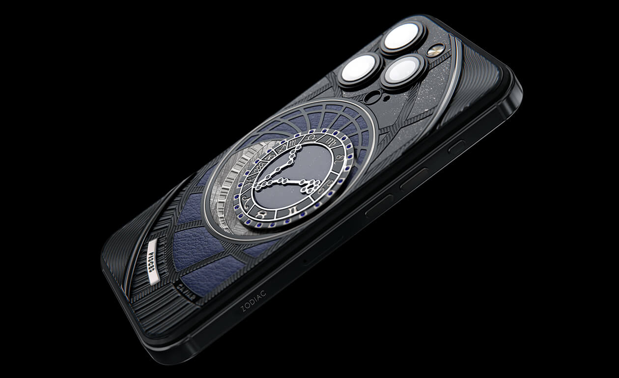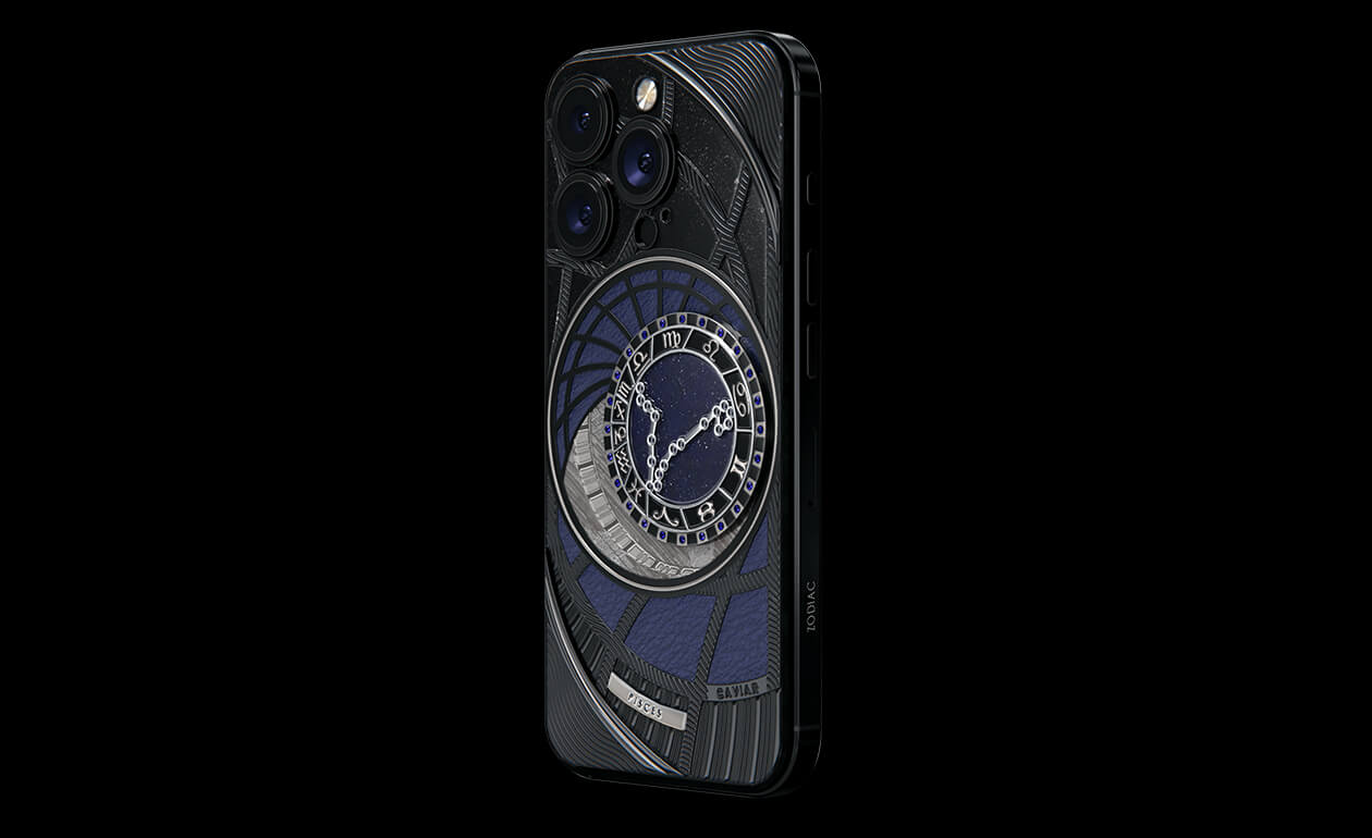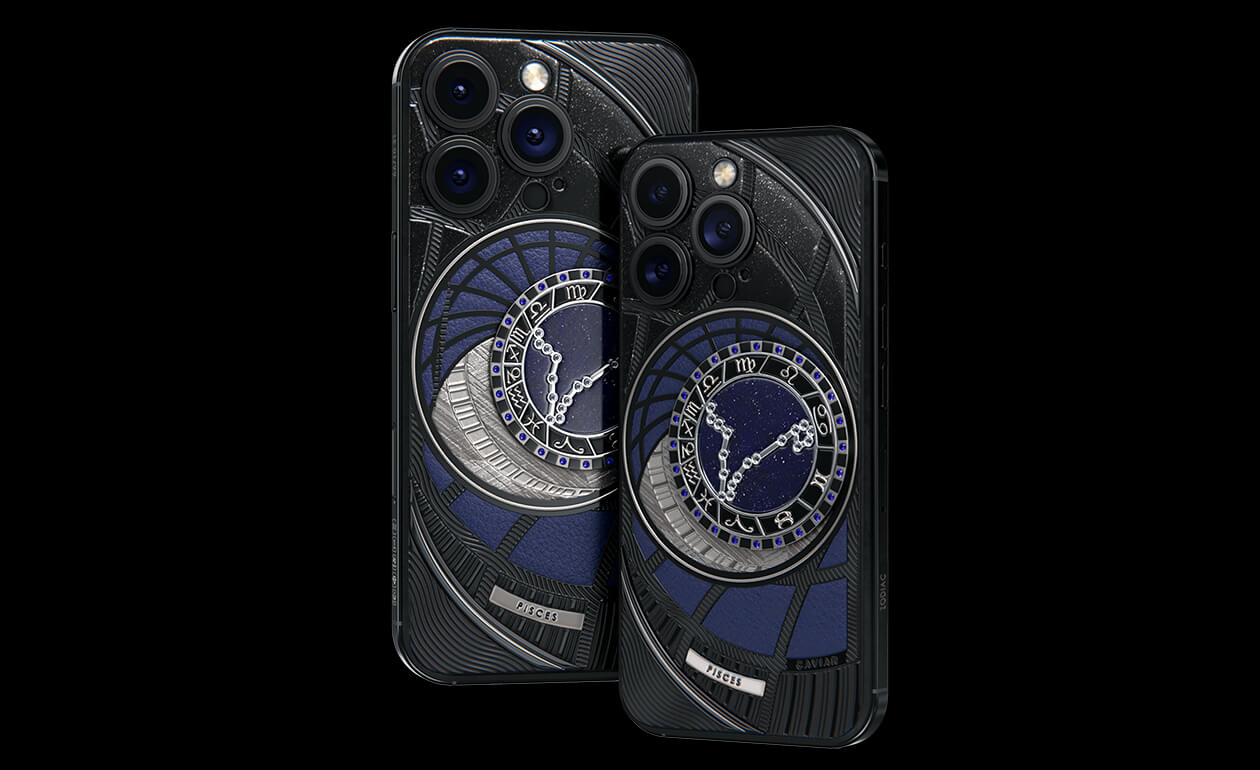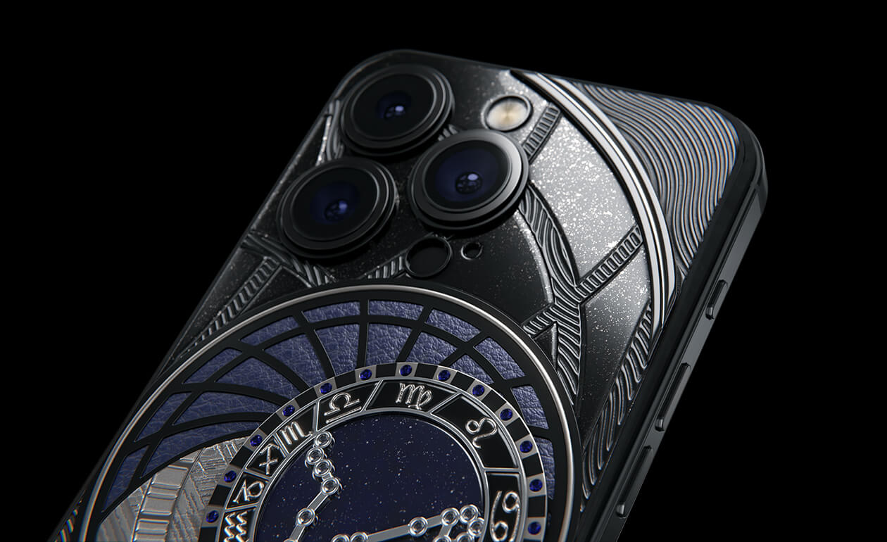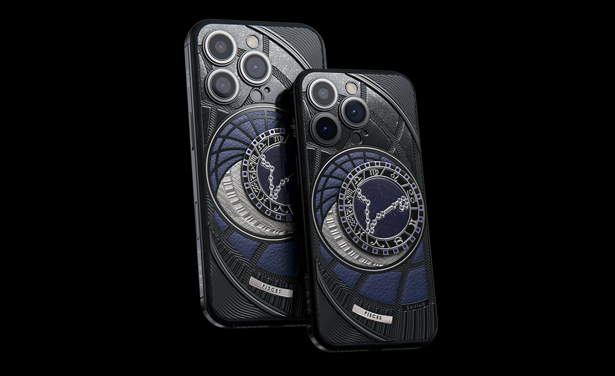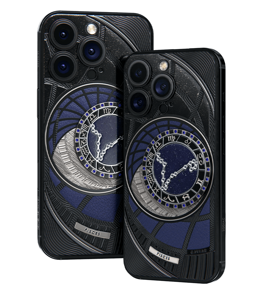 Pisces, today we present to you Pisces. Your smartphone has a sky vault with your stars on it. This is a panel of 24 sapphires, created on black titanium with a PVD coating. We emphasized the shine of the sapphire placer with an blue composite plate and finished the composition with a fragment of a meteorite on calfskin in a bright shade of indigo.