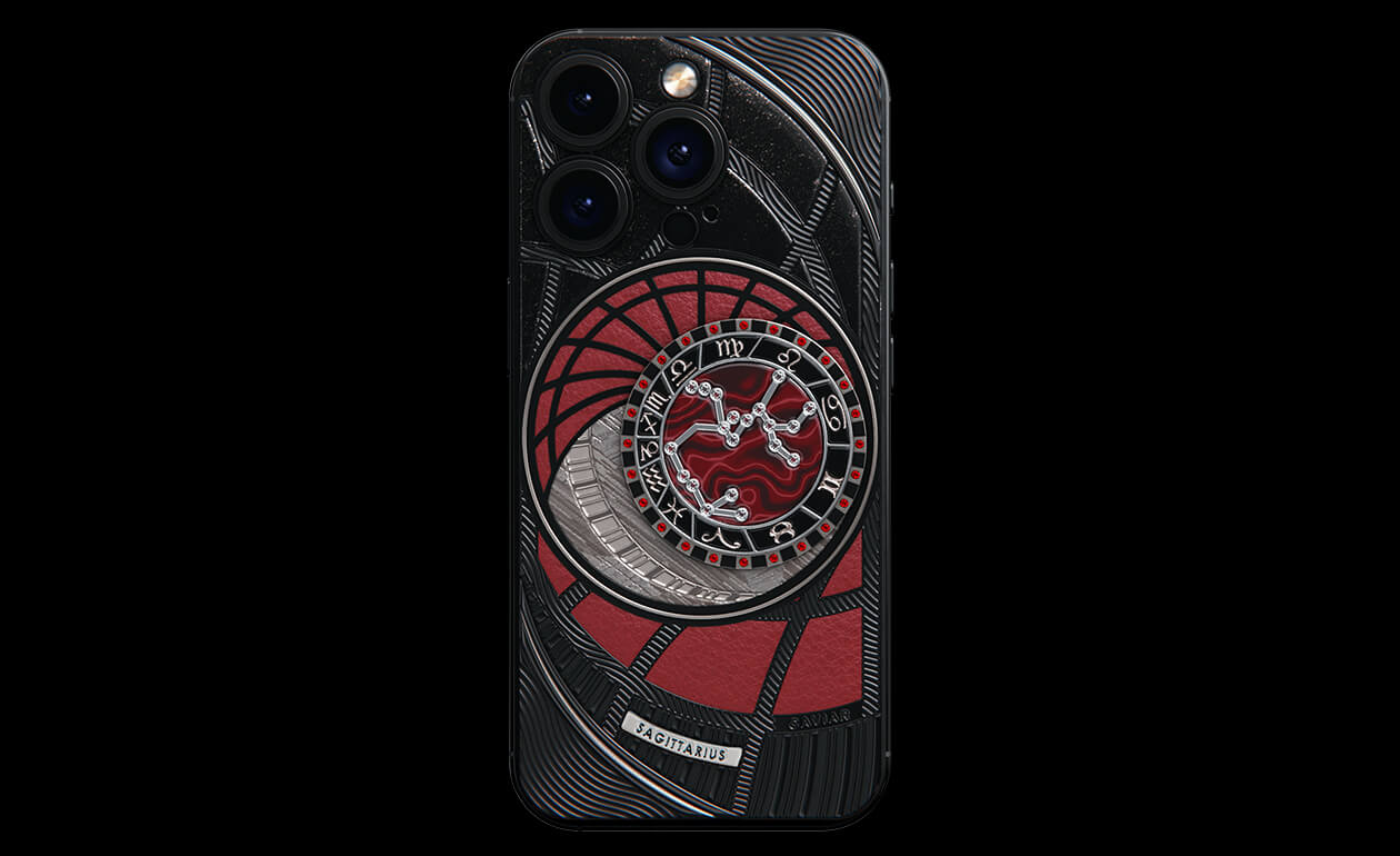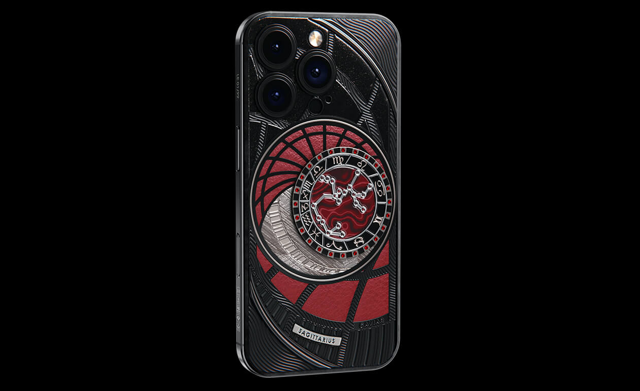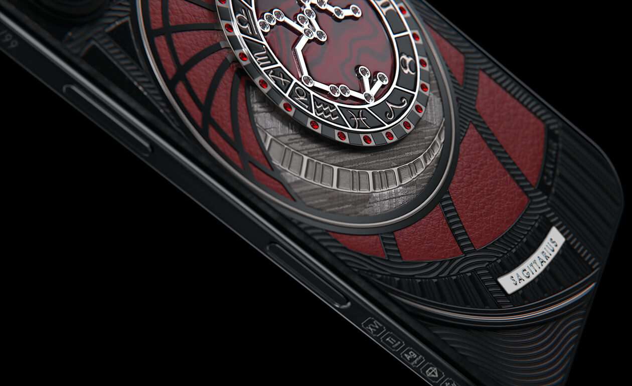 Sagittariuses, today we present to you Sagitarius. Your smartphone has a sky vault with your stars on it. This is a panel of 24 rubies, created on black titanium with a PVD coating. We emphasized the glow of the ruby placer with a plate of red composite and finished the composition with a fragment of a meteorite on calfskin in a bright carmine shade.