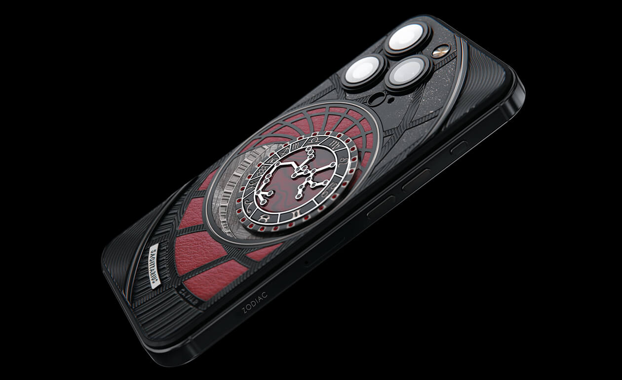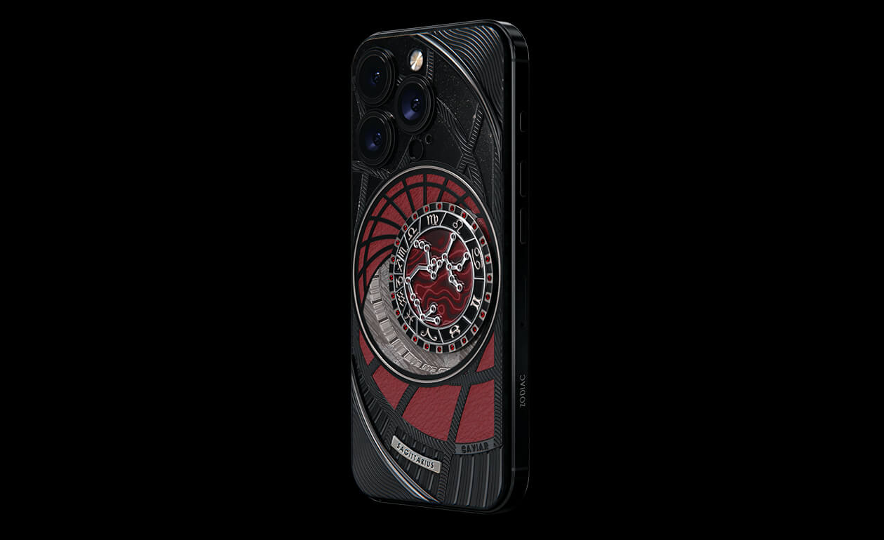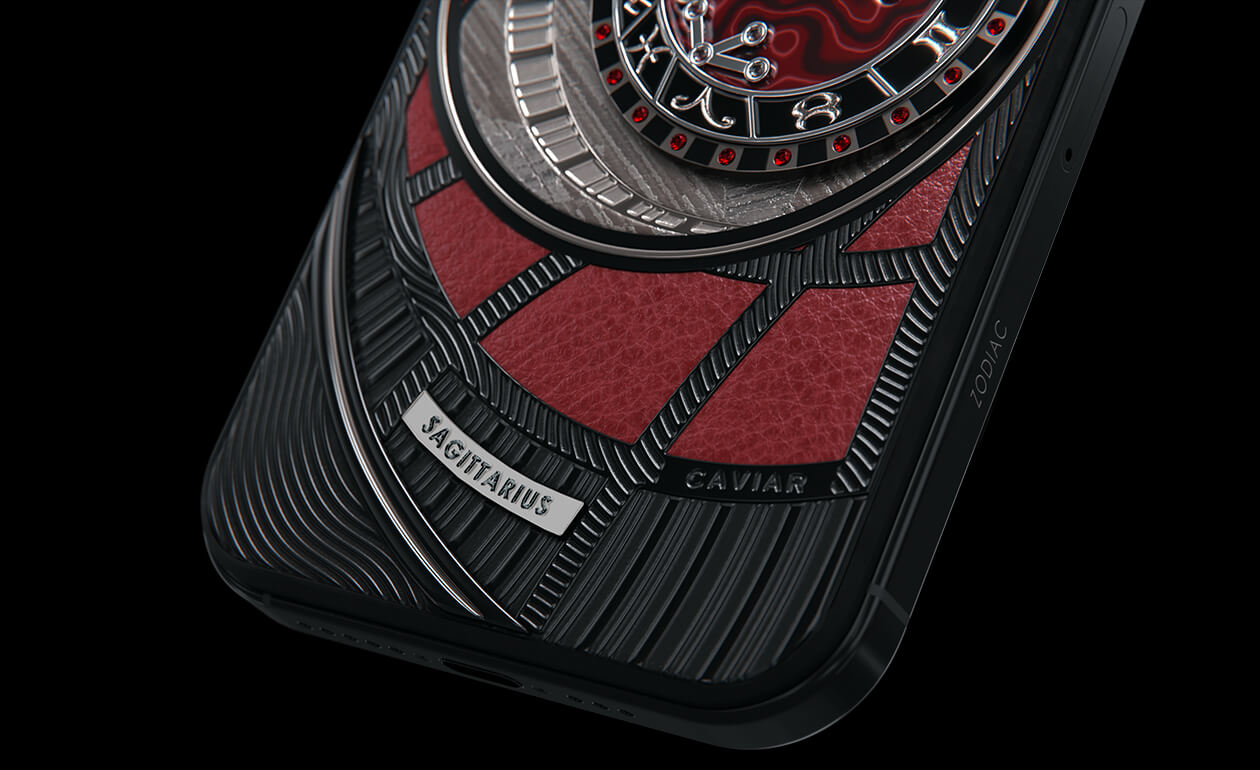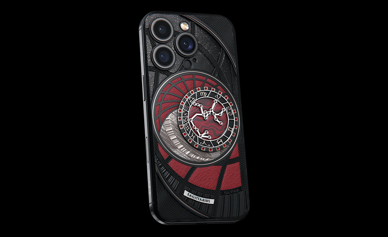 Sagittariuses, today we present to you Sagitarius. Your smartphone has a sky vault with your stars on it. This is a panel of 24 rubies, created on black titanium with a PVD coating. We emphasized the glow of the ruby placer with a plate of red composite and finished the composition with a fragment of a meteorite on calfskin in a bright carmine shade.