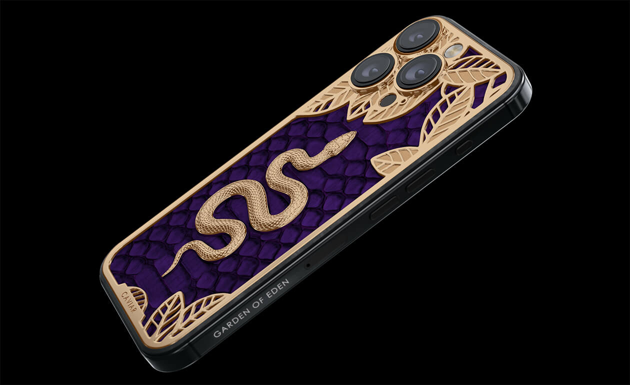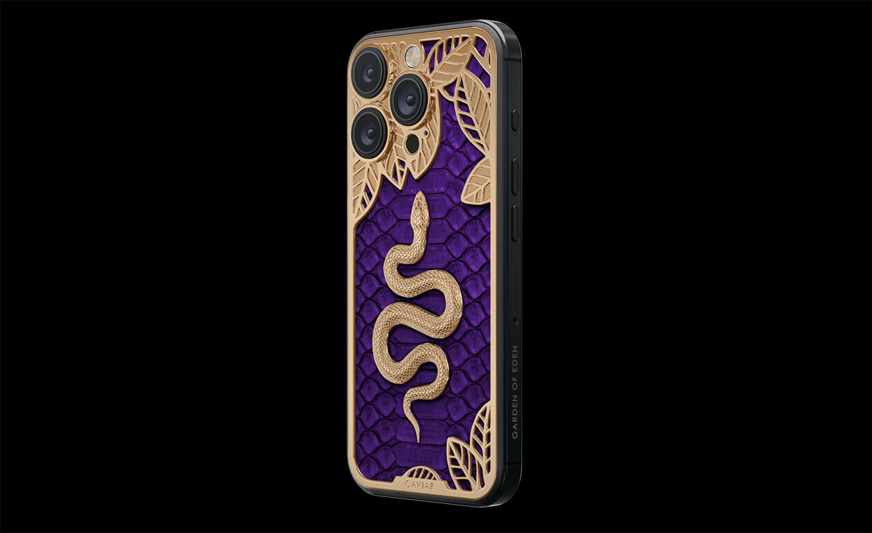 The elegant snake by Caviar is covered with the purest 24K gold. In contrast to the purple skin of the python, it seems that it sparkles, nestled among the gilded leaves of the Garden of Eden.