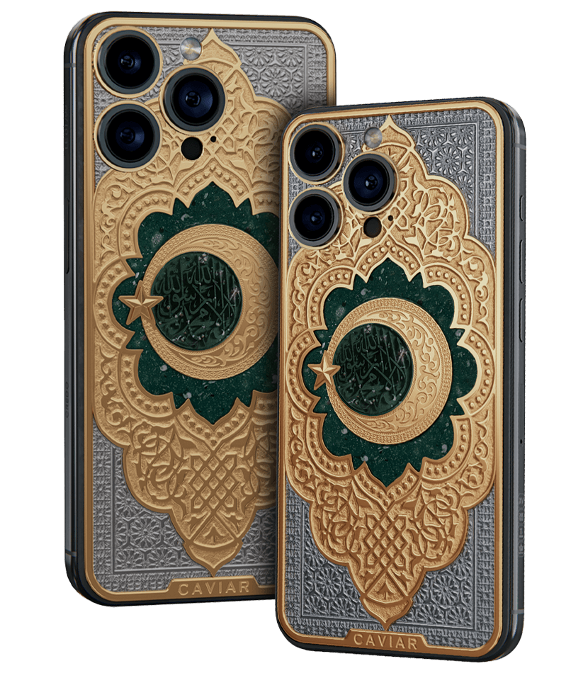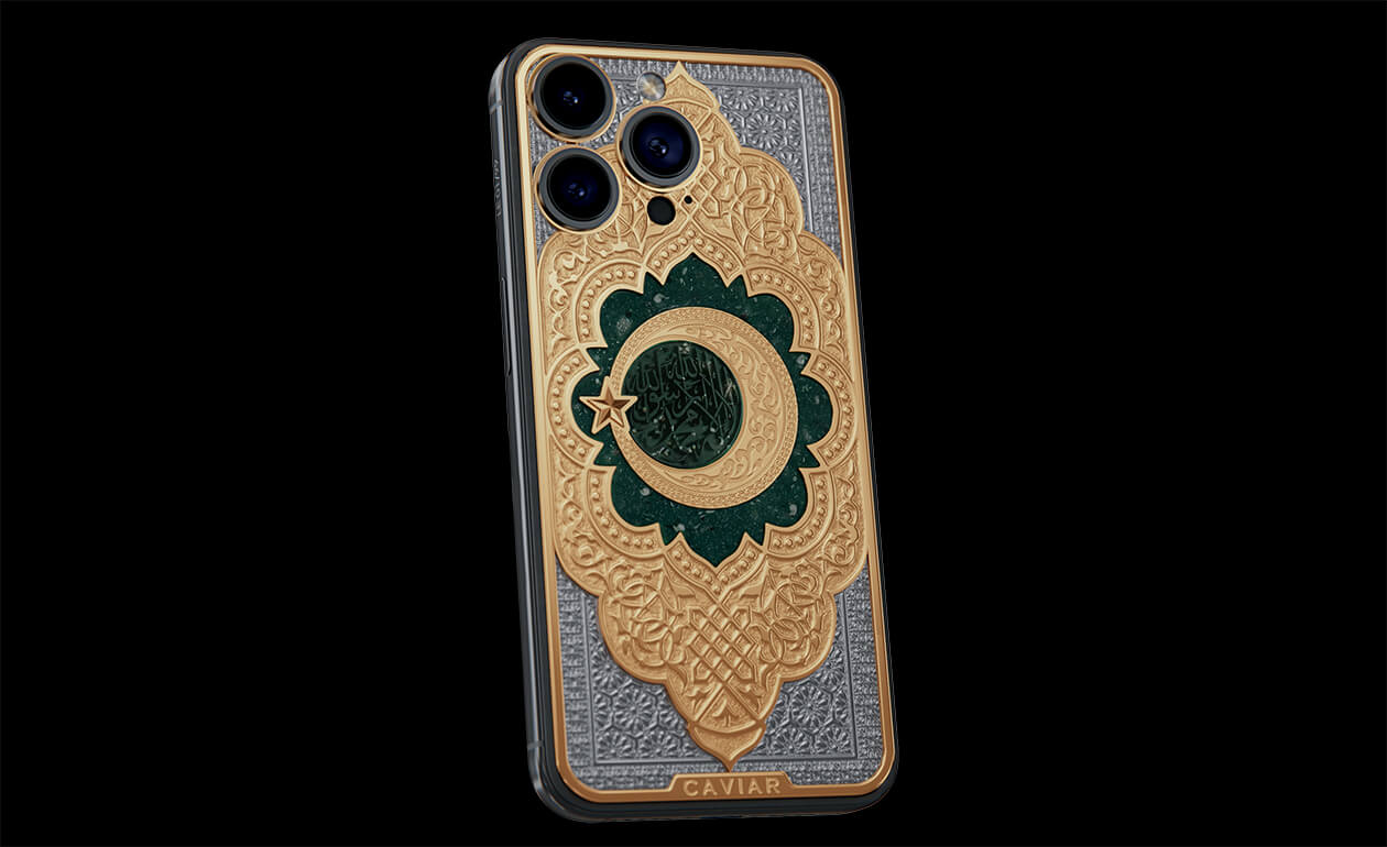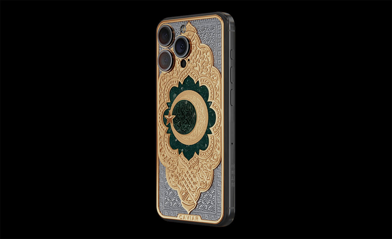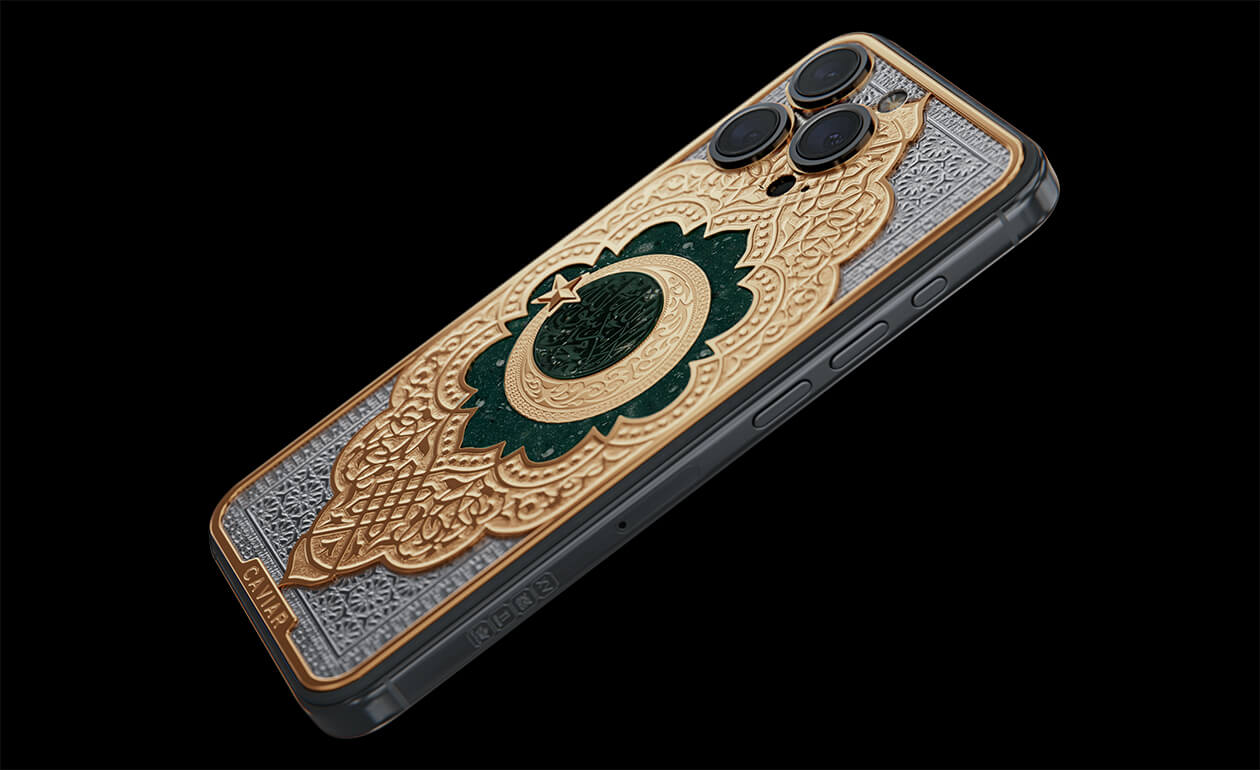 This luxurious custom iPhone 15 Pro is adorned with a three-dimensional panel covered in 24-karat gold, inspired by the Muslim architecture of the classical mosques of Mecca, Damascus, and Medina.