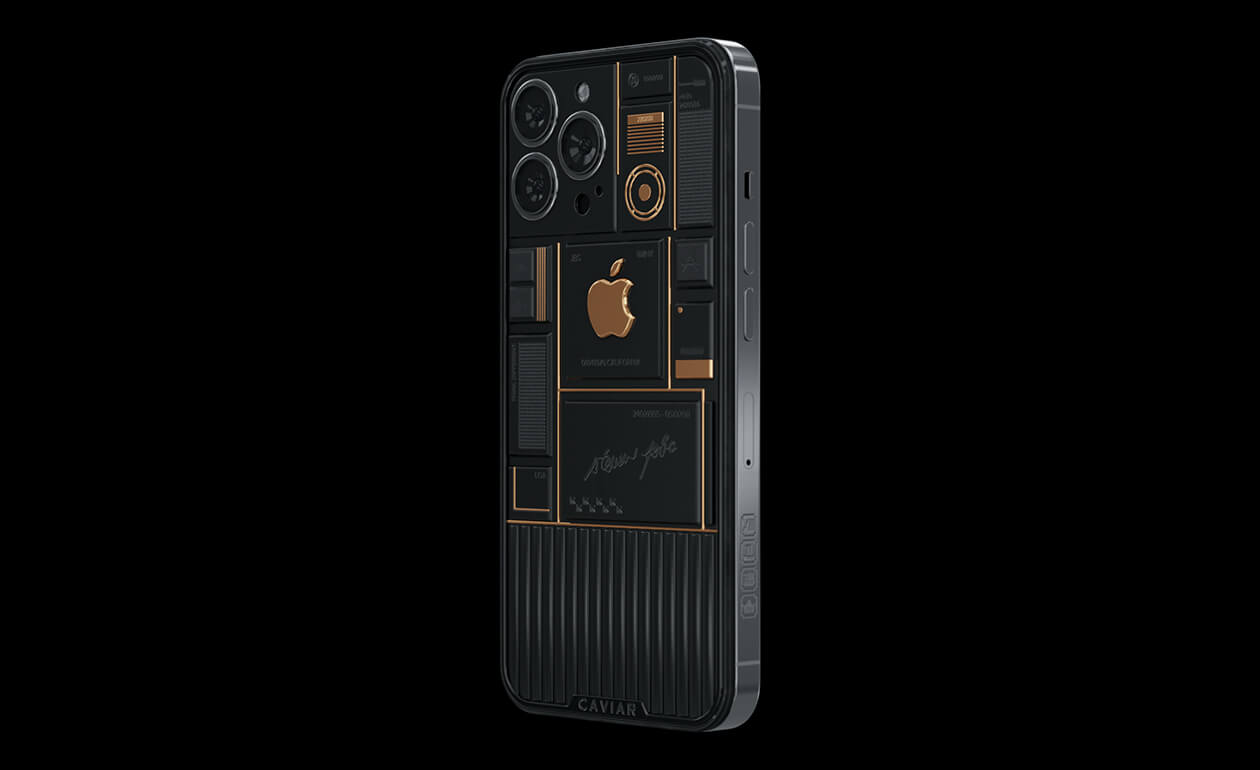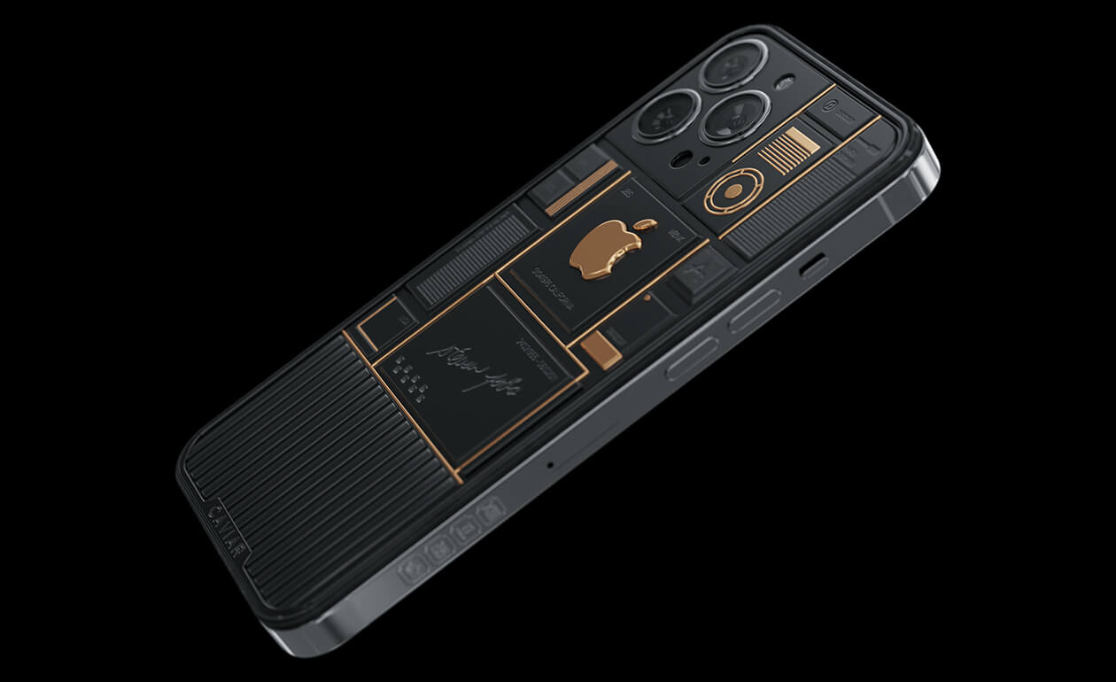 The Steve Jobs-inspired iPhone 16 Pro is crafted from impact-resistant black PVD titanium. The heart of the design is Apple's signature - a golden bitten apple. Contrasting decorative elements, plated with 24-karat yellow gold in double electroplated technique, a luxurious duo of deep blacks and precious metal shine.