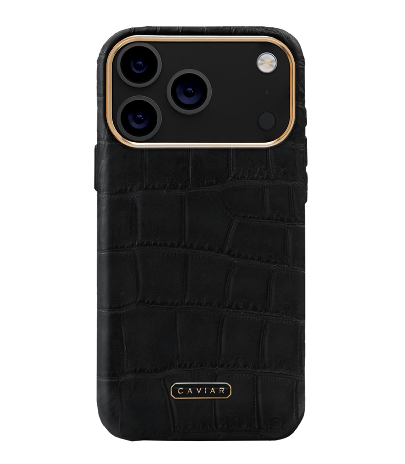 An absolute bestseller: deep black crocodile leather with discreet gold accents.