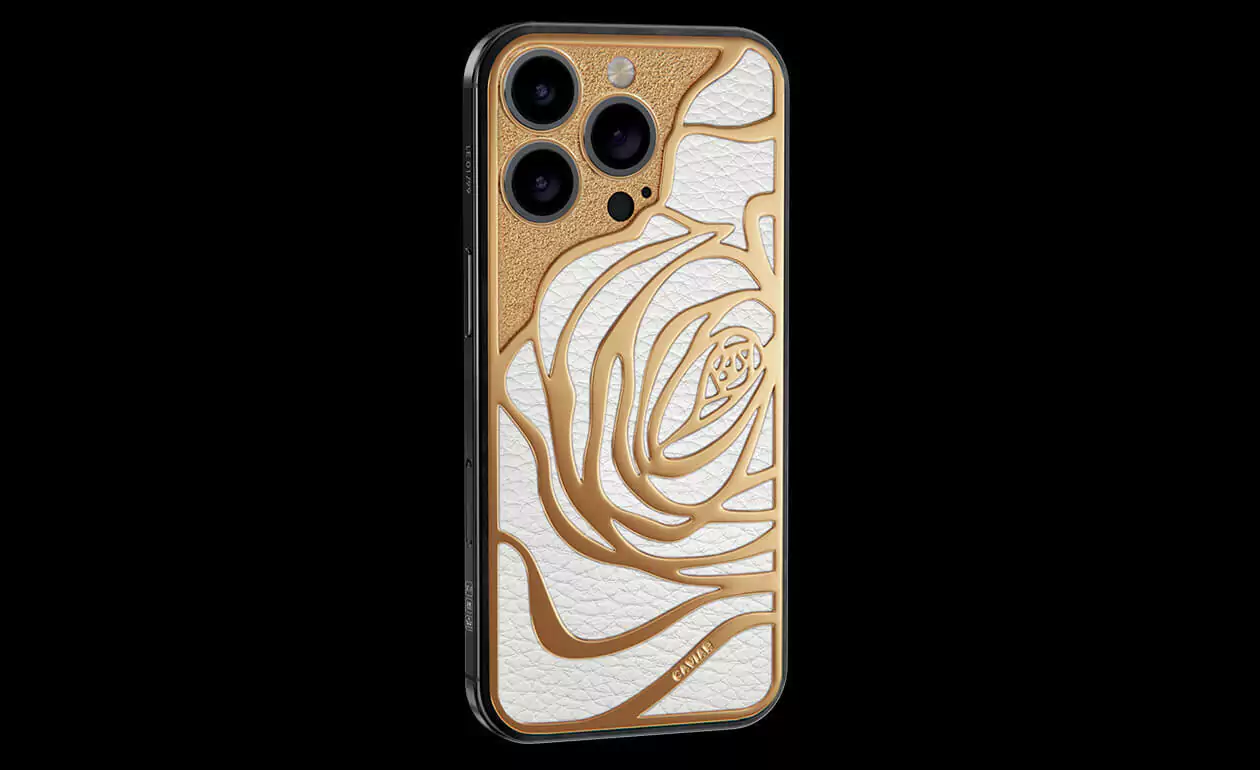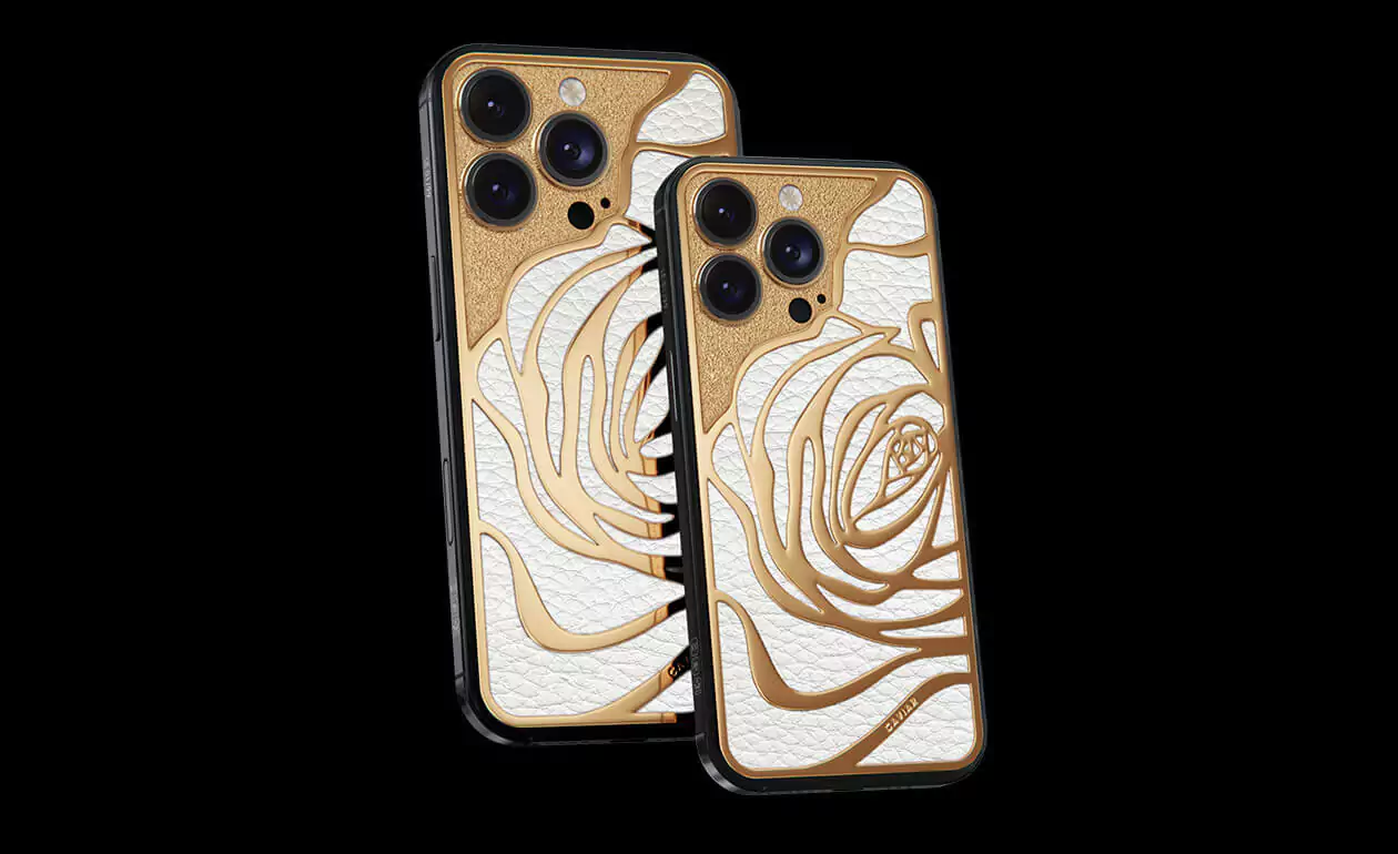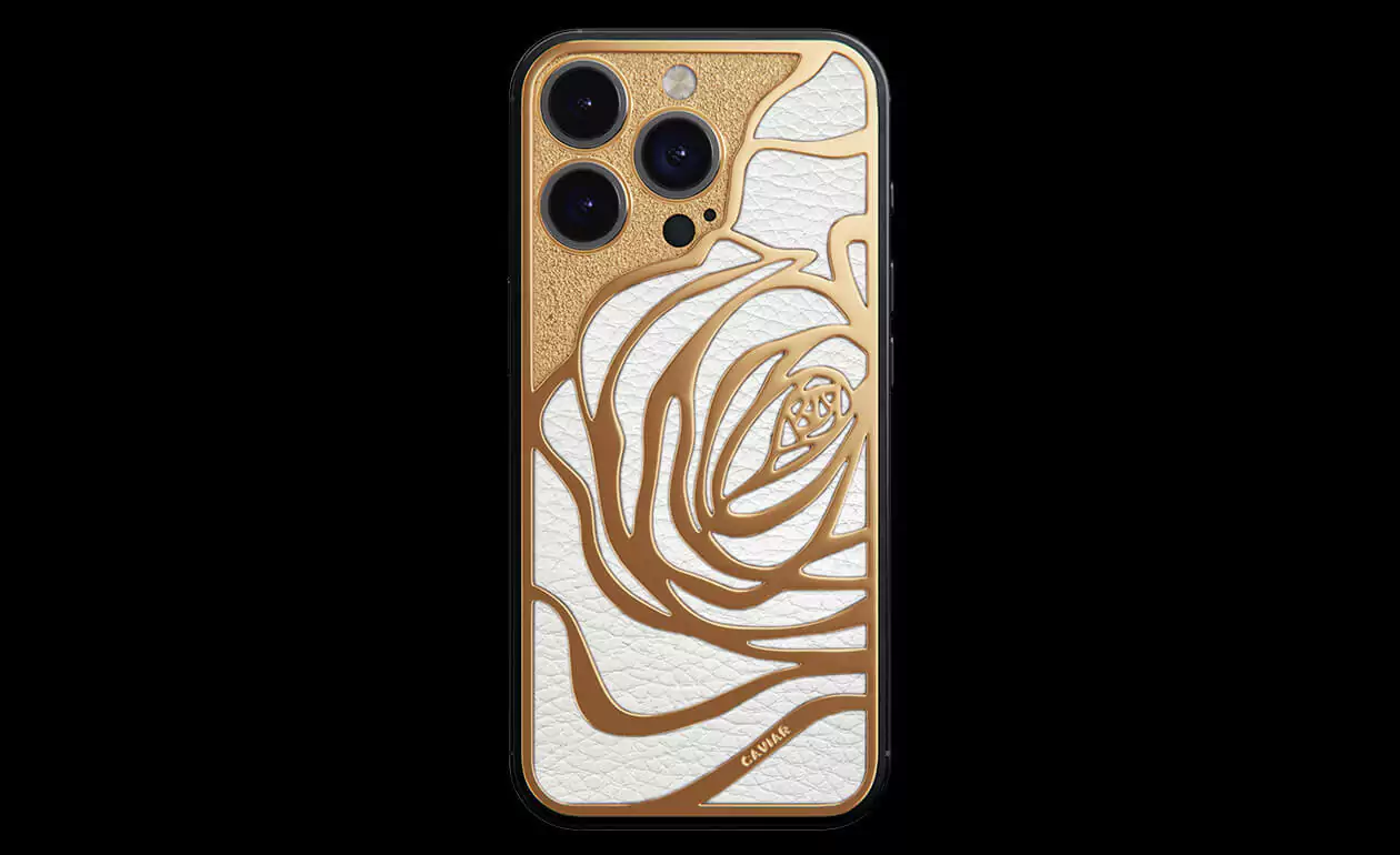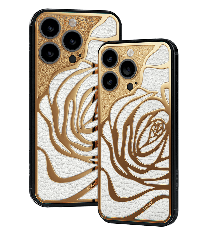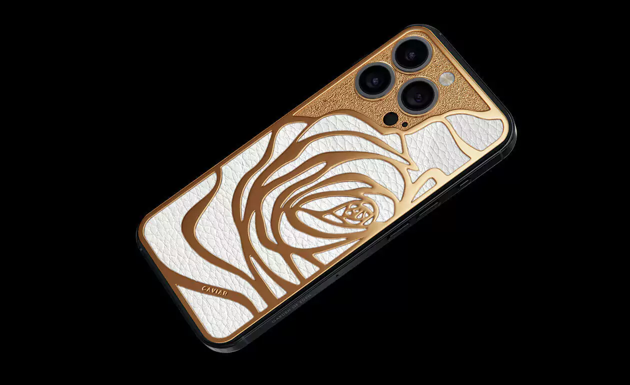 Golden Rose by Caviar embodies a sincere declaration of love. Our shining rose is made of jewelry alloy, covered with a double layer of 24K gold, and white calfskin. The smartphone is based on the gold version of the iPhone 16 Pro.