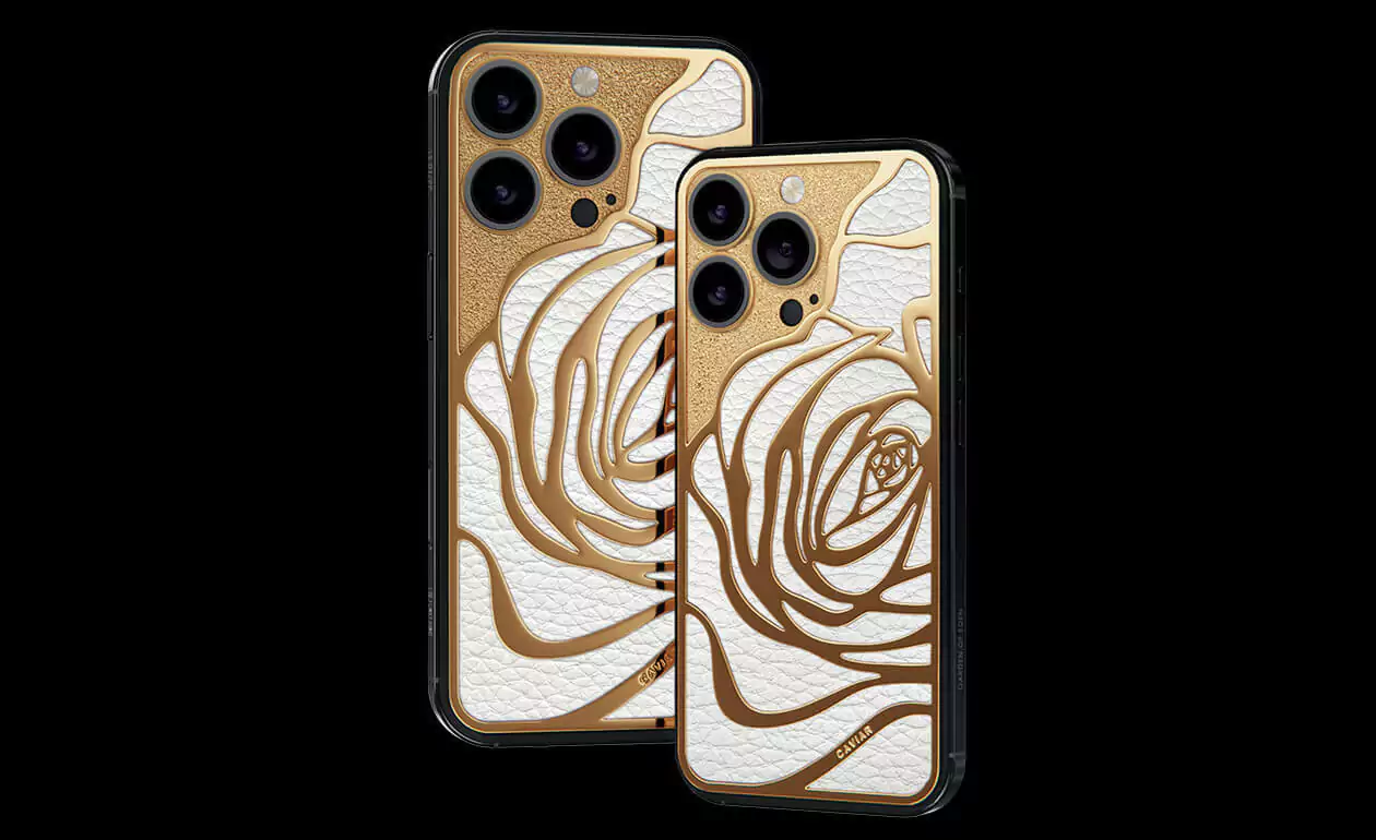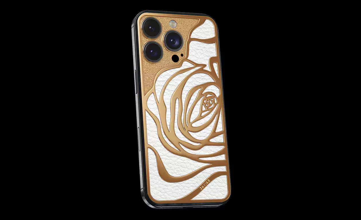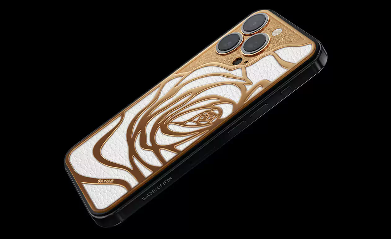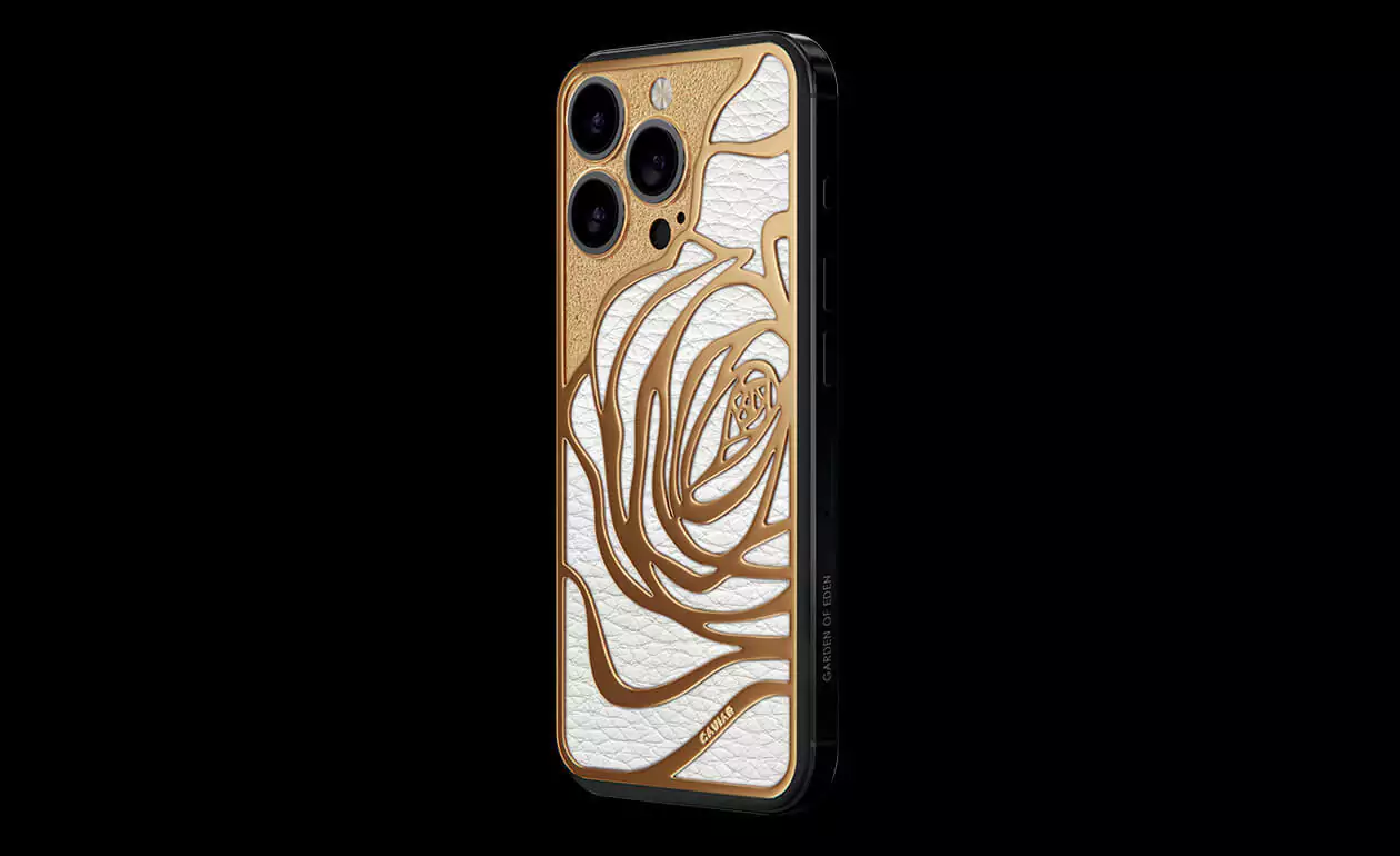 Golden Rose by Caviar embodies a sincere declaration of love. Our shining rose is made of jewelry alloy, covered with a double layer of 24K gold, and white calfskin. The smartphone is based on the gold version of the iPhone 16 Pro.