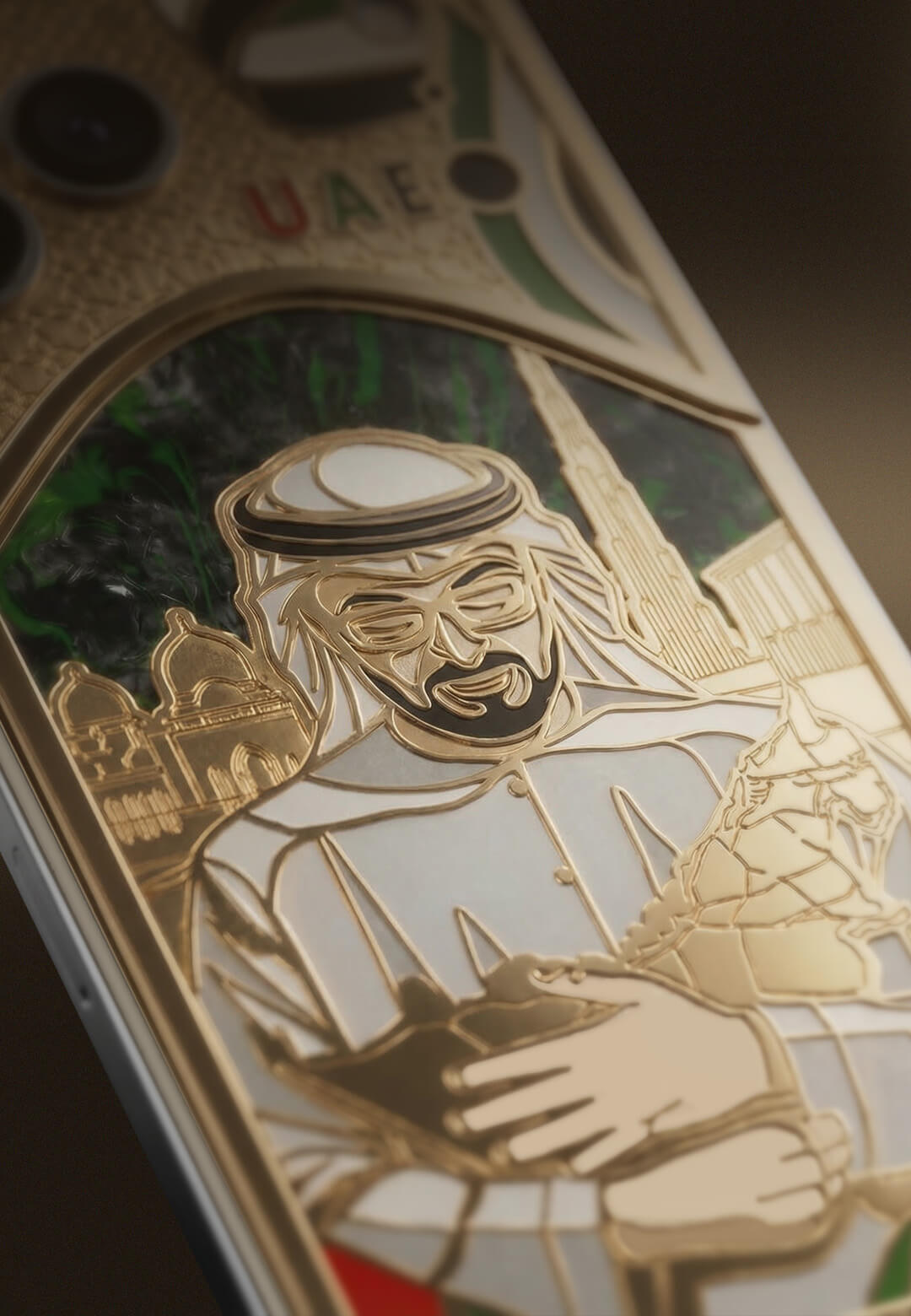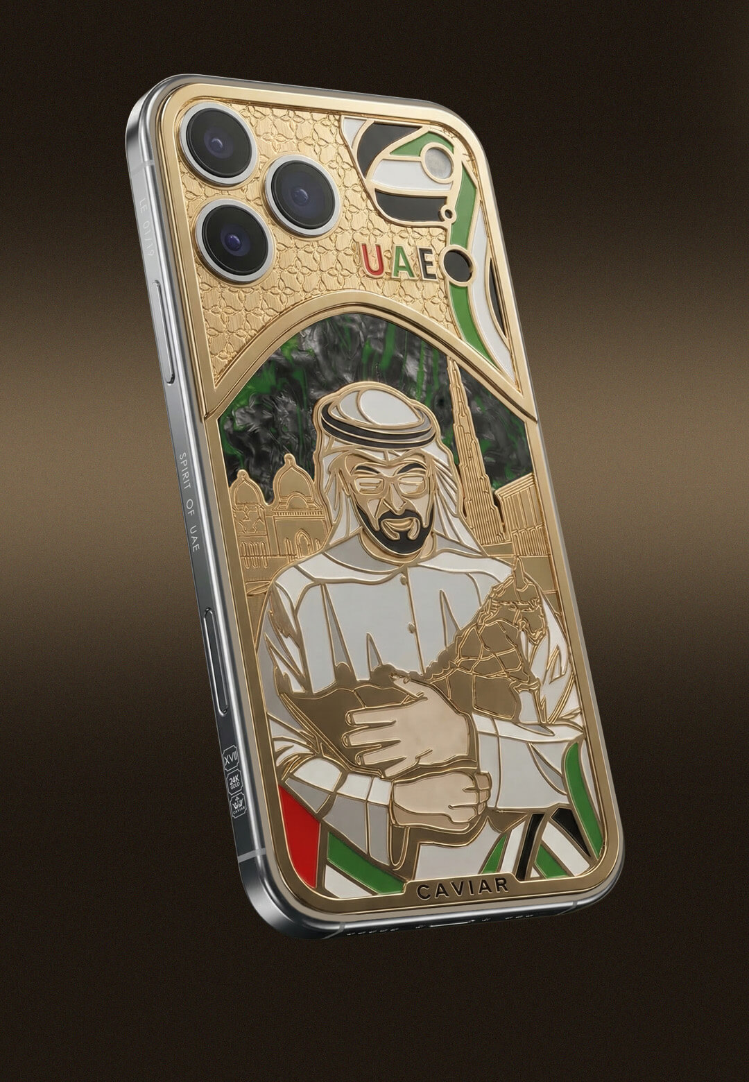 Spirit of UAE is a new custom smartphone created as a symbol of support for the United Arab Emirates. The centerpiece of the composition is an image of the UAE President, Mohammed bin Zayed Al Nahyan, gently holding a map of the nation in his hands.