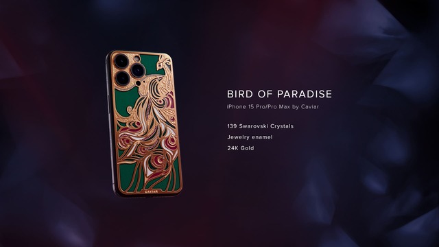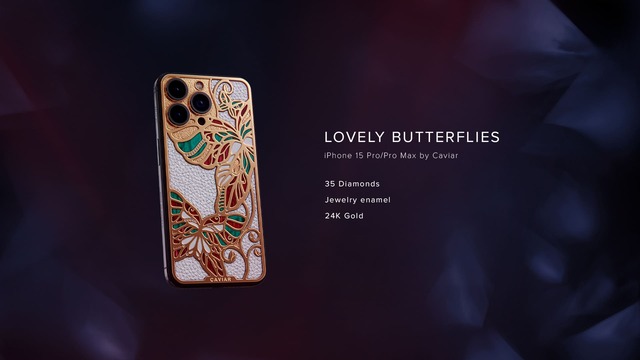 The iPhone 15 Pro Bird of Paradise is accented with 24K gold plating and adorned with 139 Swarovski crystals. The Wonderful Orchid boasts red calfskin, enhanced by 24K gold plating, featuring 9 diamonds, and delicately finished with enamel accents. The Lovely Butterflies model is embellished with white calfskin, showcases 35 diamonds and is elegantly finished with luxurious 24K gold plating.