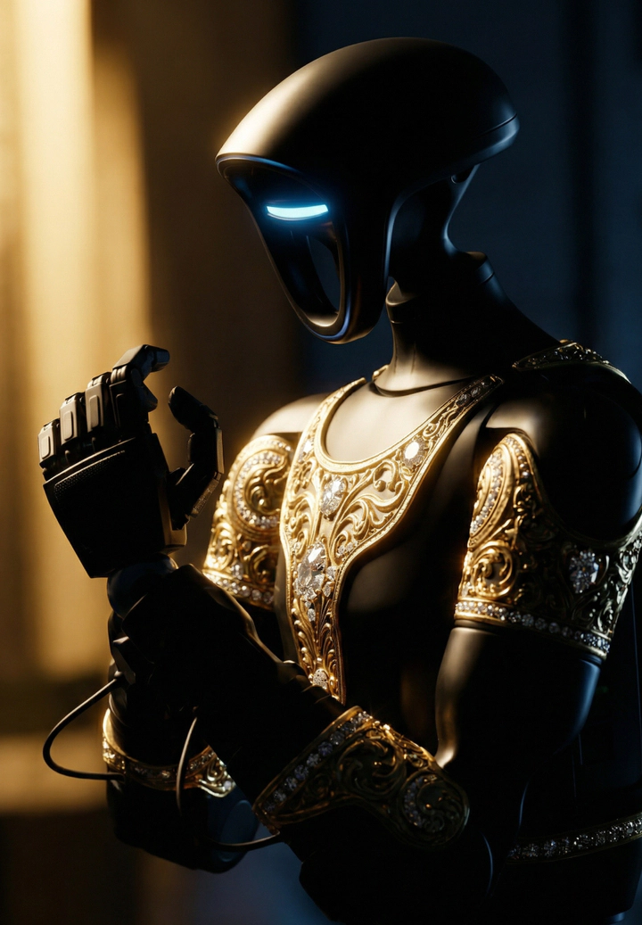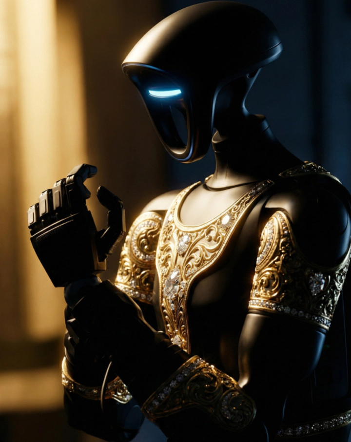 Aladdin captivates at first glance, uniting futurism with Eastern decorative tradition. Its body is finished in deep black and adorned with delicate gilded patterns. Arabesques and ornamental motifs cover the panels and joints, giving the robot the appearance of a luxurious artifact that guards an ancient secret. Black symbolizes depth and the infinity of knowledge, while gold represents power, wisdom, and value. In motion, the gilding shimmers softly, creating the impression of a living treasure from an Eastern legend.